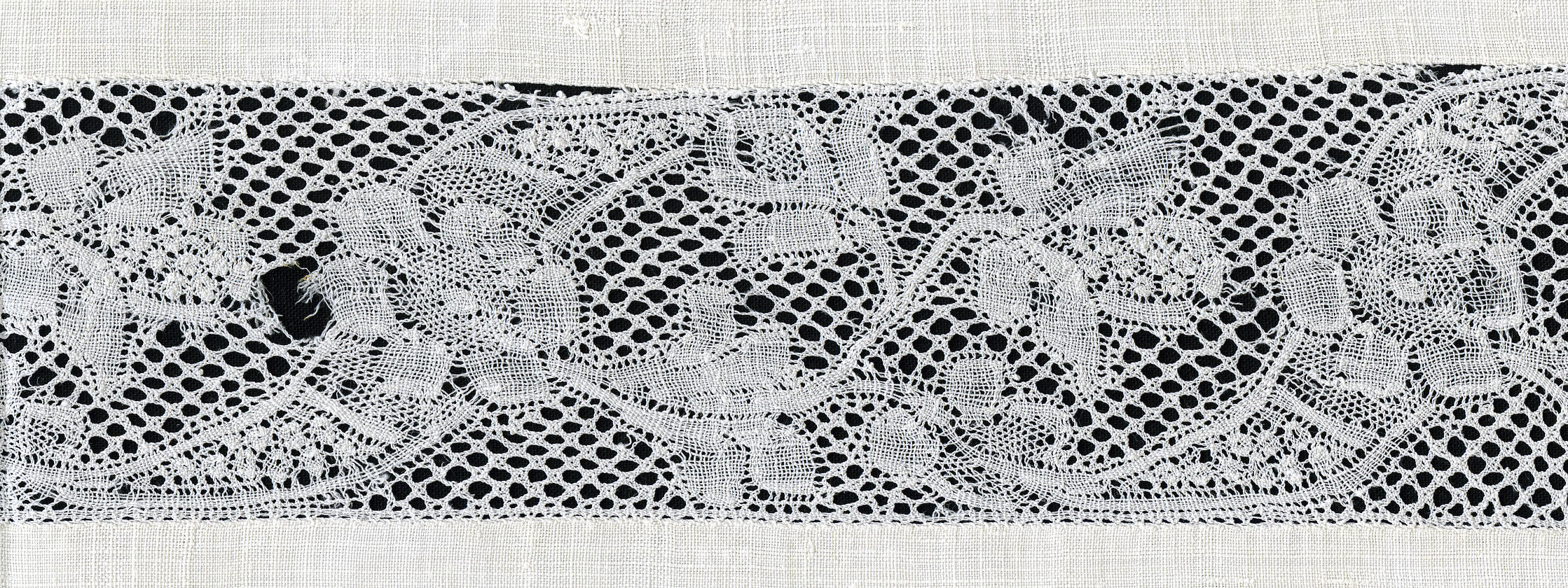 Fragment van een linnen kussensloop met een tussenzetsel van Valenciennes kloskant van 5,5 centimeter breed. De kant heeft een vijfgaatjesgrond. In de motieven is een siergrond toegepast, zogenaamde 'eksteroogjes'. De kant is te dateren vanaf het midden van de achttiende eeuw. In de sloop zijn nog vaag de resten aanwezig van een geborduurd motief en ...