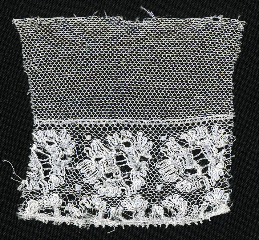 Fragment van een muts, bestaande uit een stuk Rijselse kloskant en een stuk machinale tule. De kloskant heeft vrij onregelmatige mazen.