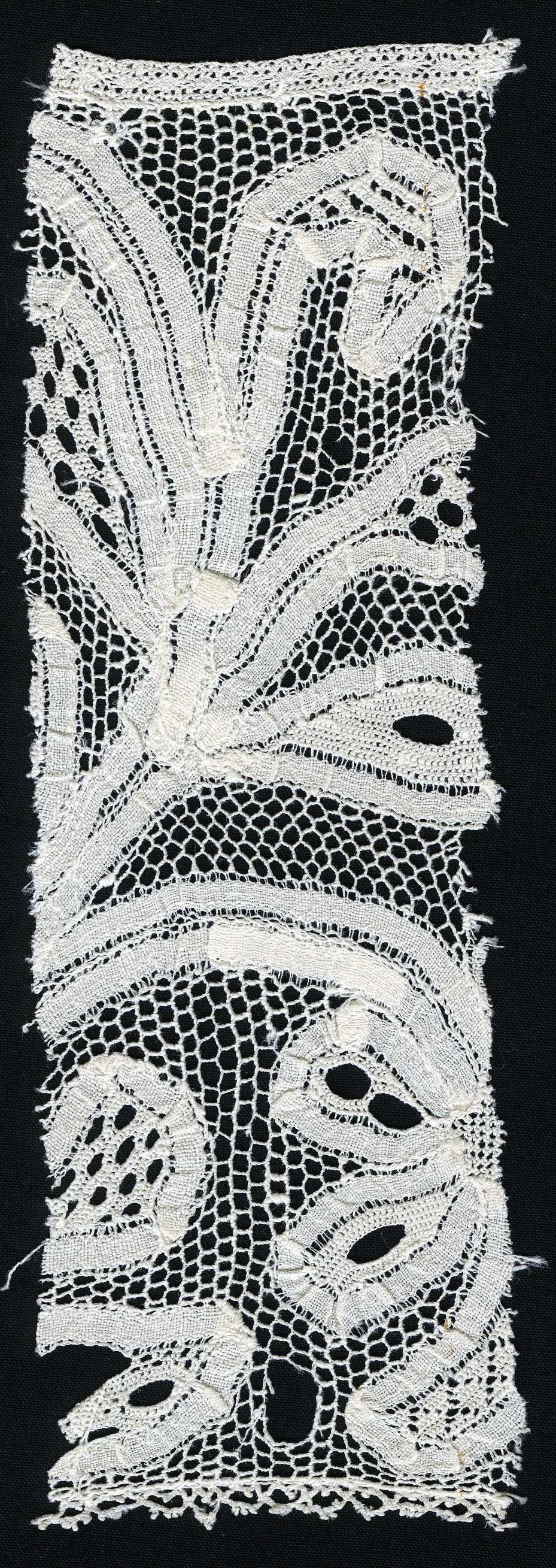 Een stuk gemengde kant, vervaardigd aan het eind van de negentiende of het begin van de twintigste eeuw. De motieven worden gevormd door machinaal geweven lint. De openingen en de grond zijn met naaldkant opgevuld. Het agrementje aan de bovenzijde en de afwerking aan de onderzijde zijn machinaal vervaardigd. Dit is zogenaamde Milanese lintkant, vervaardigd ...