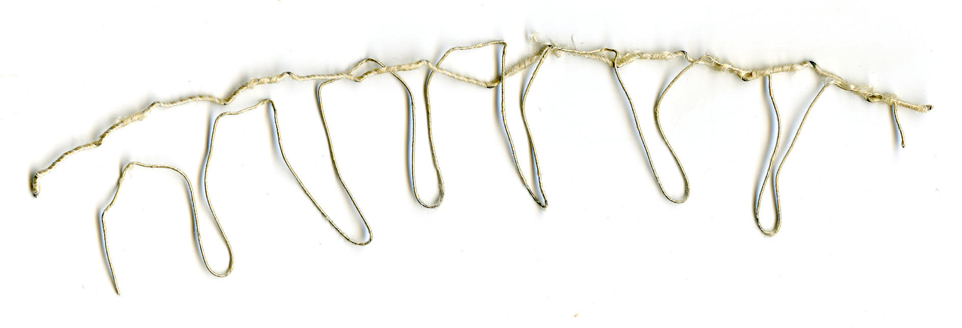 Een stuk karkas, afkomstig uit de voorstrook van een knipmuts uit Rijssen. Het karkas bestaat uit een dikke en een dunne koperdraad, beide omwonden met wit zijden garen. Het dunne koperdraad is in lussen van circa 3 centimeter gebogen. Beide koperdraden zijn door middel van de zijden draad met elkaar verbonden. Tot in het eerste ...