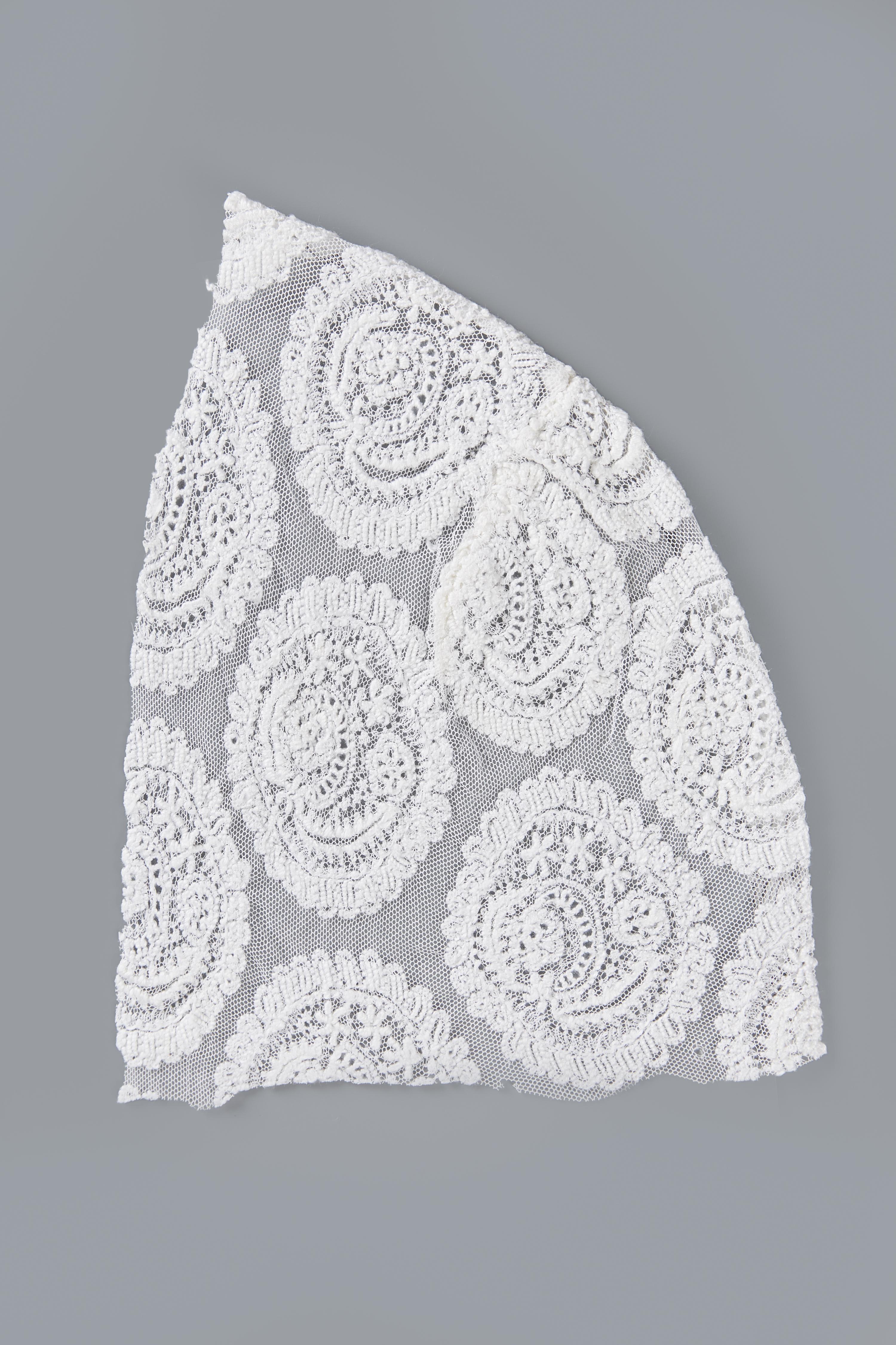 Bol van een knipmuts uit Rijssen, vervaardigd van versierde tule. De motieven zijn circa 7 centimeter hoog en circa 5,5 centimeter breed.
