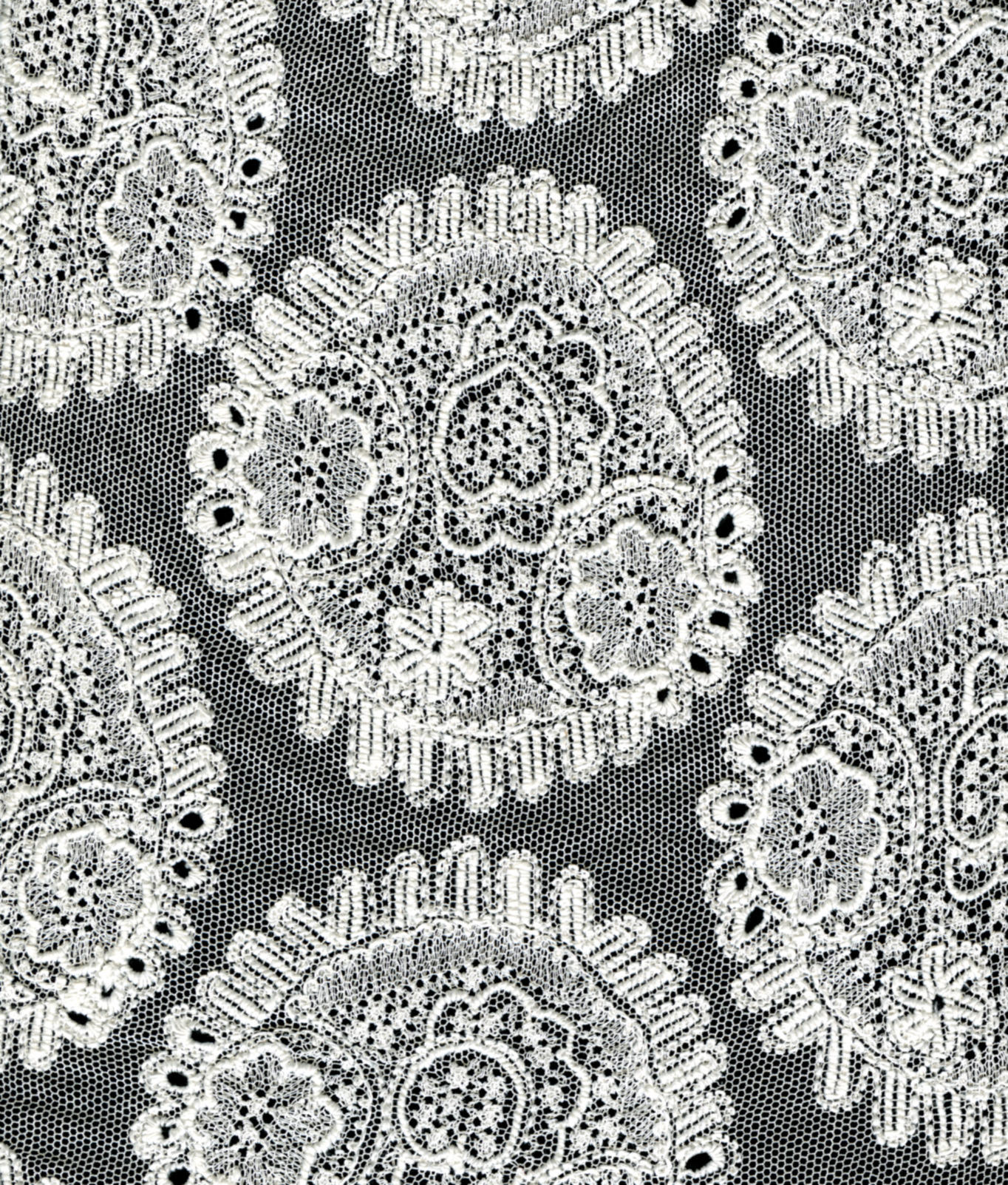 Fragment van de bol van een knipmuts van de Noordwest-Veluwe. De mutsenbol is vervaardigd van versierde tule, zogeheten plumetis. De motieven hebben een diameter van circa 7 centimeter.