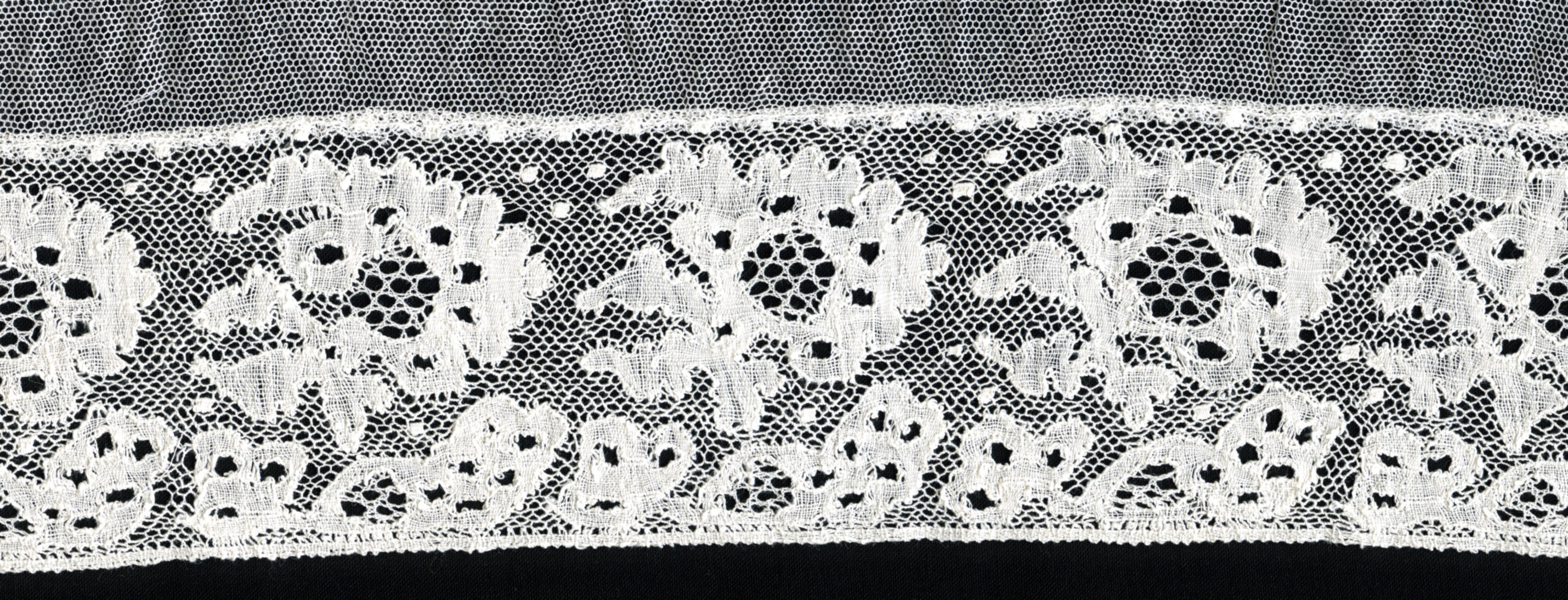 Gedeelte van een achterstrook van een knipmuts uit Rijssen. De achterstrook bestaat uit een strook machinale tule en een strook Rijselse kloskant. De kant is circa 7 centimeter breed en heeft een rapport van circa 6 centimeter. De tule en kantstrook zijn met de naaimachine aan elkaar gezet en de beide zijden zijn met de ...