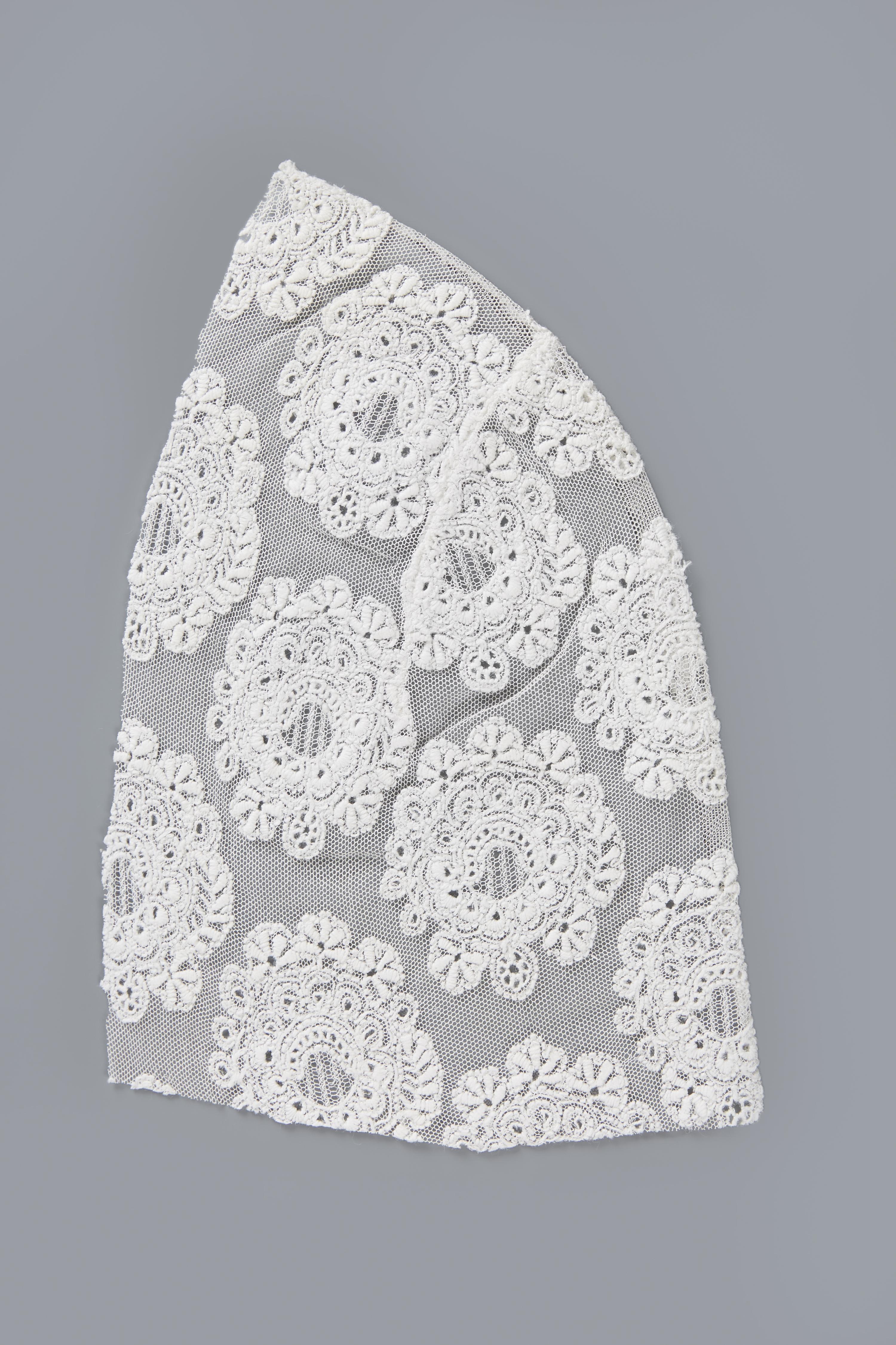 Fragment van de bol van een knipmuts uit Rijssen. De mutsenbol is vervaardigd van versierde tule, zogeheten plumetis. De motieven zijn circa 6 centimeter hoog en 5,5 centimeter breed. De bol hoort bij de kantstrook met inventarisnummer ST 1062.
