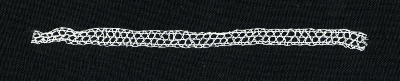 Machinaal vervaardigde angrelure. Angrelures worden tussen de kantstrook en het te versieren voorwerp gezet, zodat bij het lostornen en weer aannaaien van de kant de eigenlijke kant niet beschadigd raakt.