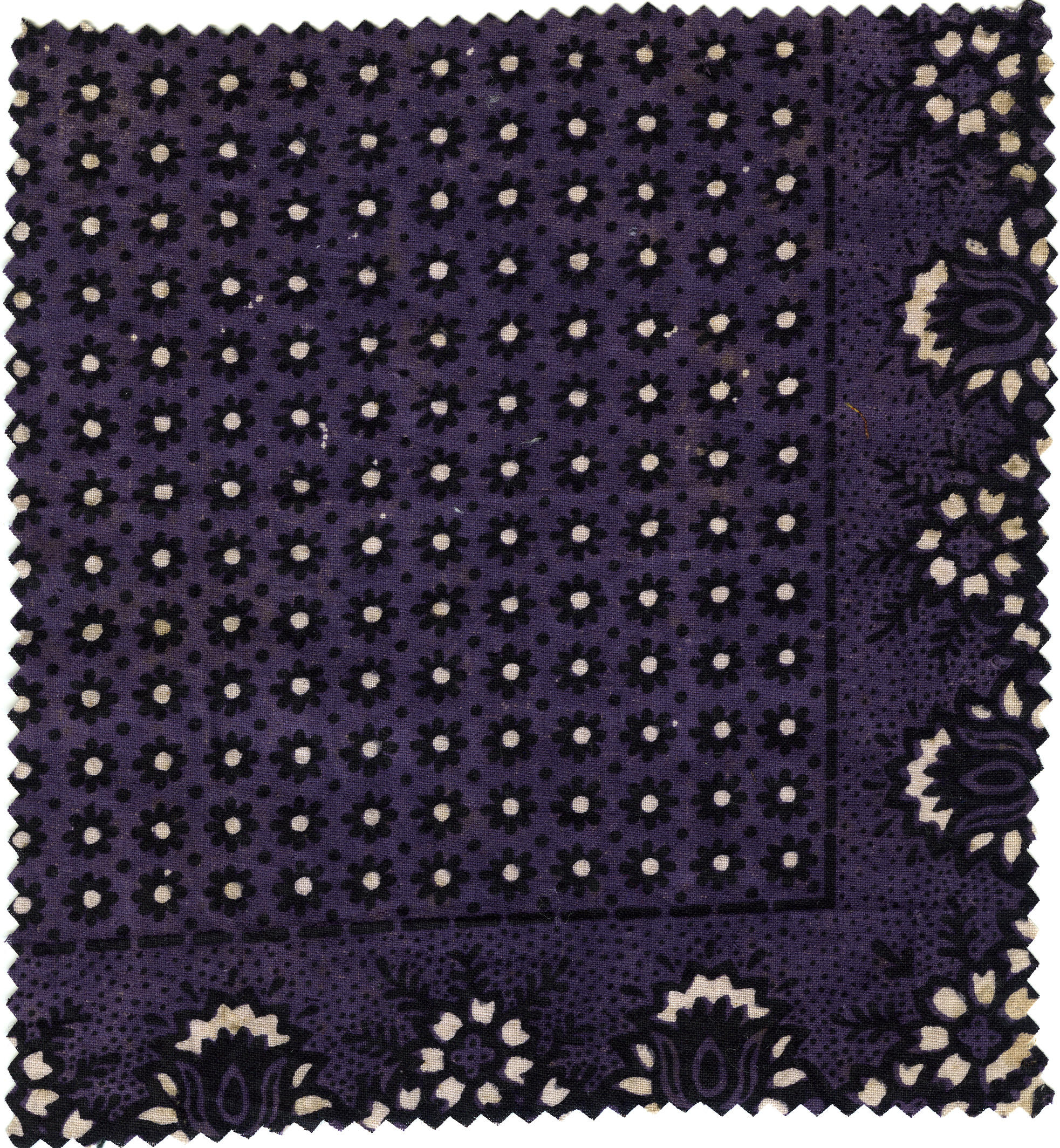 Gedessineerde katoen met een paars fond met uitgespaarde witte motieven en bedrukt met zwarte motieven. Fragment van een schouderdoek uit Spakenburg die is verknipt voor een kraplap voor de 'vierljaarsrouw'.
