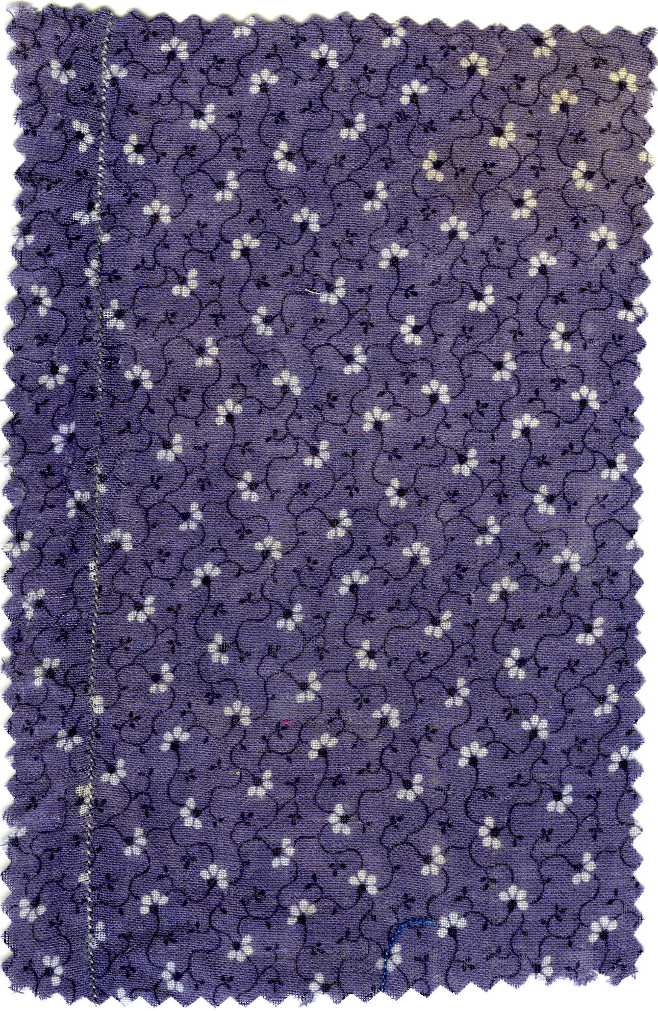 Gedessineerde katoen met een paars fond met uitgespaarde witte motieven en bedrukt met donkerpaarse motieven. Fragment van een kraplap uit Spakenburg. Een kraplap van deze stof kan gedragen worden bij de 'vierljaarsrouw'.