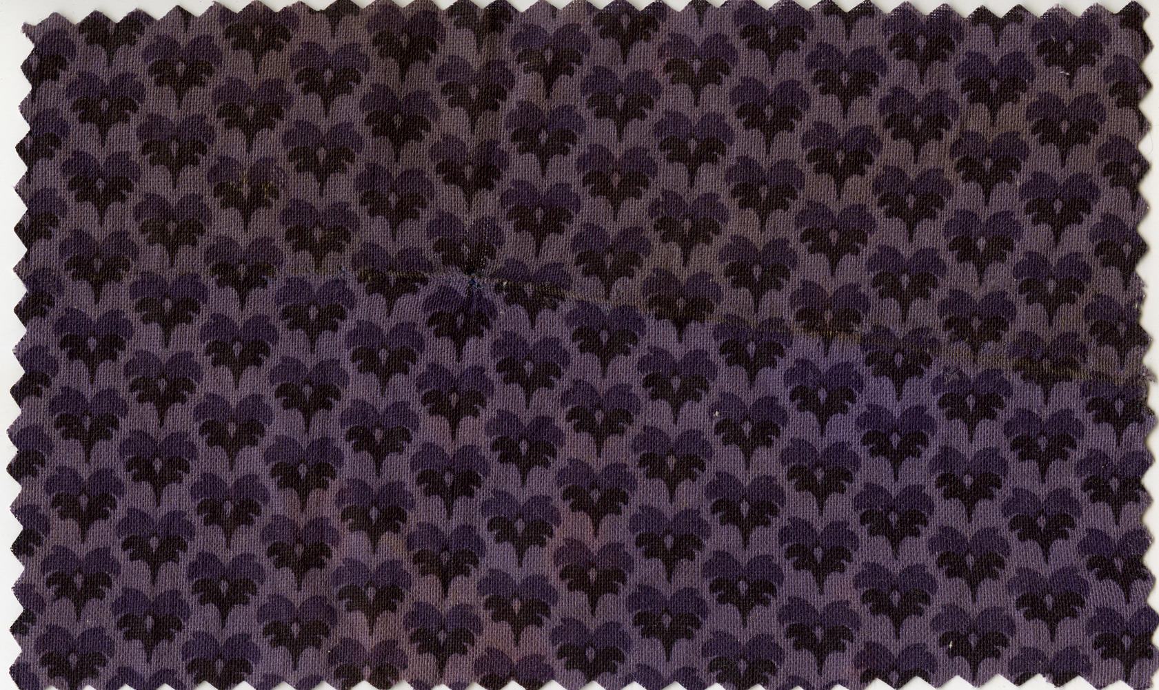 Gedessineerde katoen met een paars fond, bedrukt met donkerpaarse motieven. Fragment van een kraplap uit Spakenburg. Een kraplap van deze stof kan gedragen worden bij de 'vierljaarsrouw'.
