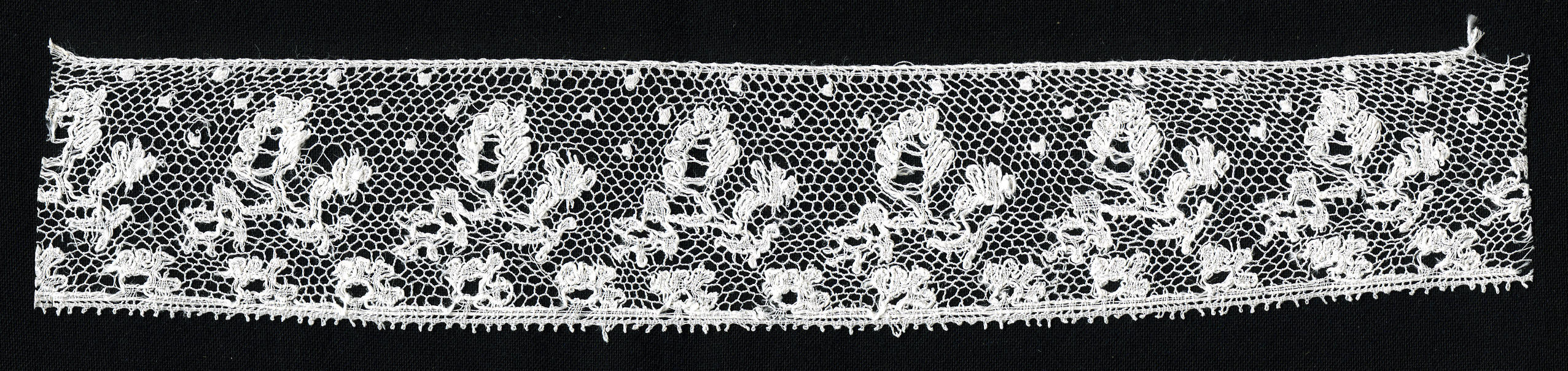 Strook Rijselse kloskant, afkomstig van de achterstrook van een 'toefmuts' (kornetmuts) uit Staphorst. De kant heeft een rapport van circa 3 centimeter. Het motief wordt ter plaatse 'fietsen' genoemd.