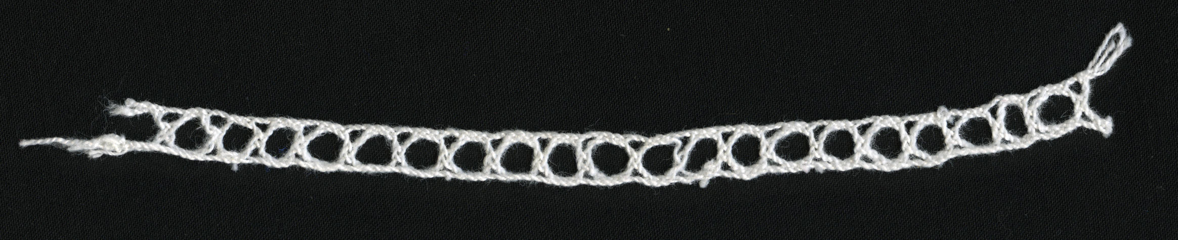 Gekloste schuif uit een kornetmuts. Door de schuif worden twee banden gehaald die in tegengestelde richting aangetrokken worden en daarmee de muts op de juiste breedte trekken. De schuif is geklost. Waar de ringen elkaar raken zit een soort vijfgaatjesmaas.