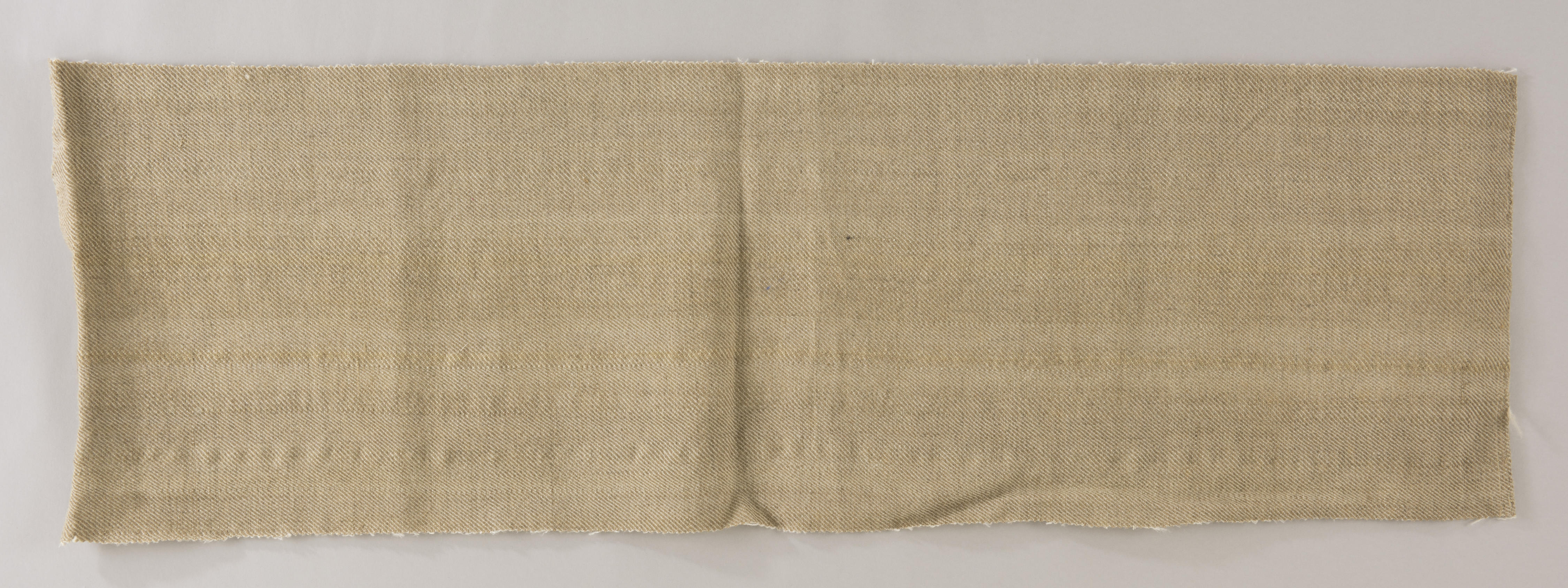 Stuk handgeweven stof, geweven in een keperbinding. De kettingdraden zijn van linnen en de inslagdraden zijn van handgesponnen wol. Bij het weven van vijfschaft is de aanbinding van de schachten aan de vijf treden als volgt: 1-3-5-2-4. In het begin van zijn carrière als wever heeft Dirk Kok zich een keer vergist in de volgorde. ...