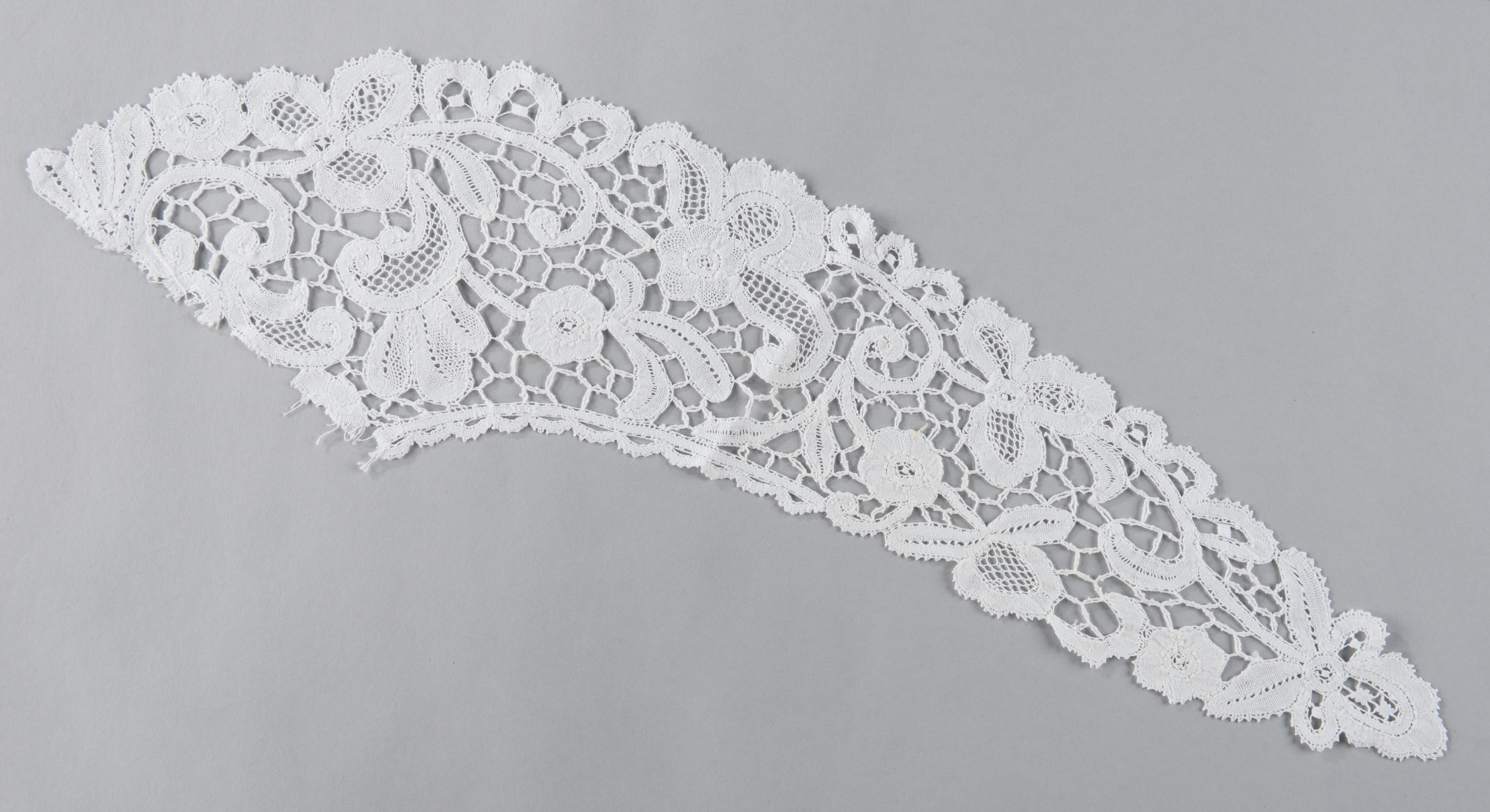 Fragment van een kraagje van duchessekant van het Brugse type. Er wordt bij duchessekant onderscheid gemaakt tussen Brugse en Brusselse duchesse. Duchessekant uit Brussel heeft meer reliëf en het type uit Brugge is vlakker. Ook de dubbele spijltjes zijn meer kenmerkend voor Brugse duchesse. Dit kraagje is in het begin van de twintigste eeuw geklost.