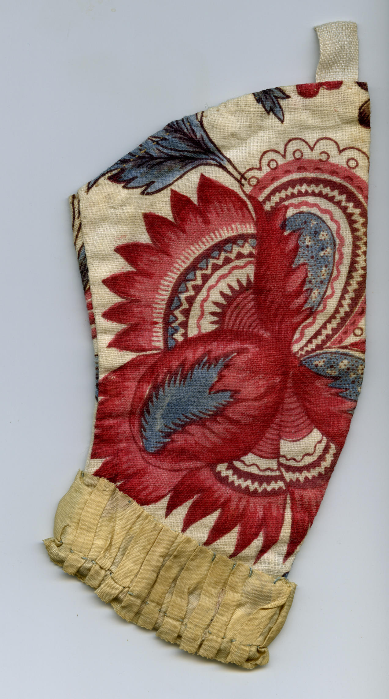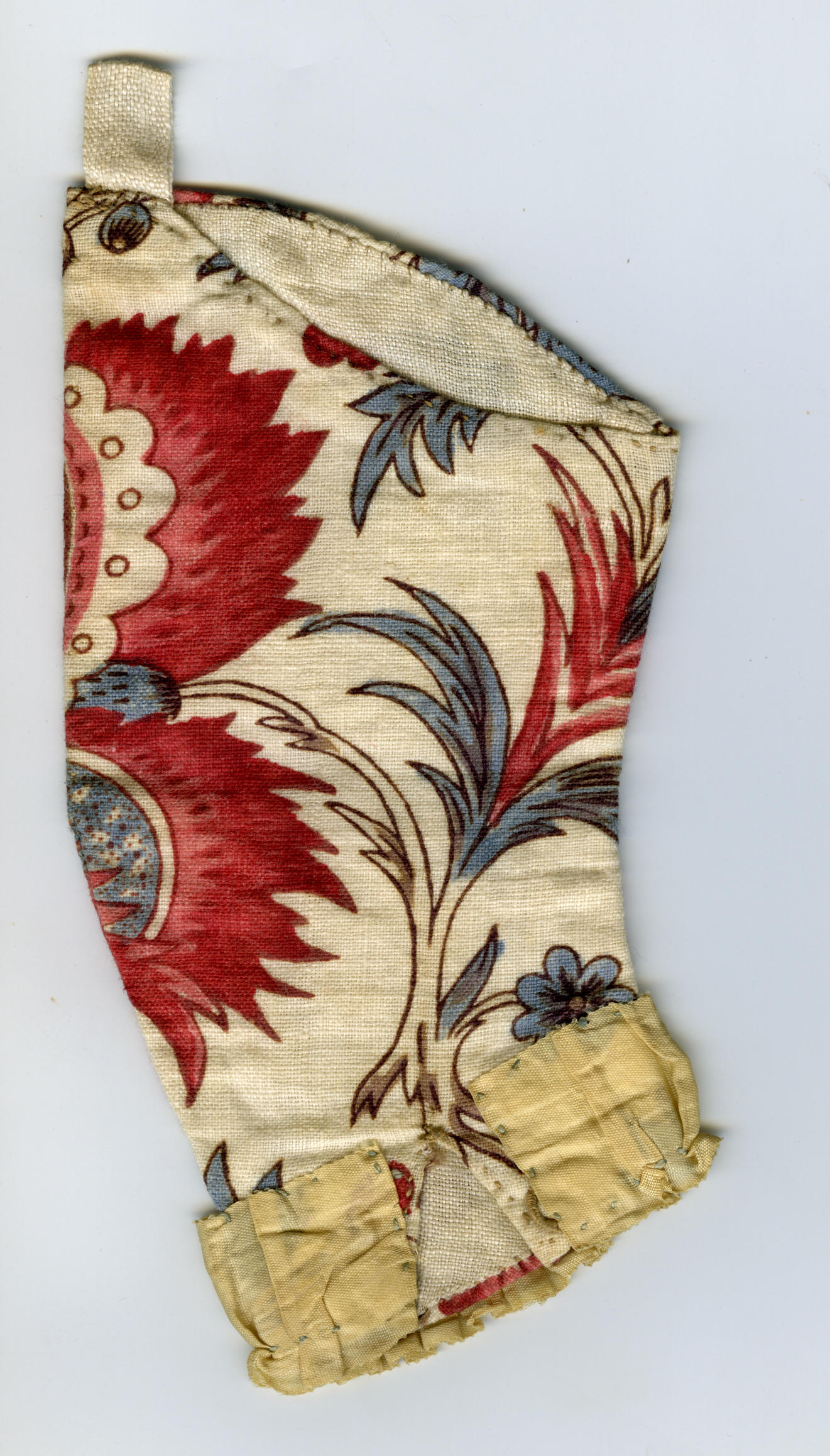 Babymouwtje van sits. Het mouwtje is gevoerd met naturelkleurig linnen. Onderlangs is het afgezet met gerimpeld zijden lint. Het mouwtje sluit met een messing oog en een trensje. Aan de bovenkant is een lusje gezet waarmee het mouwtje aan de kleding vastgezet kan worden.