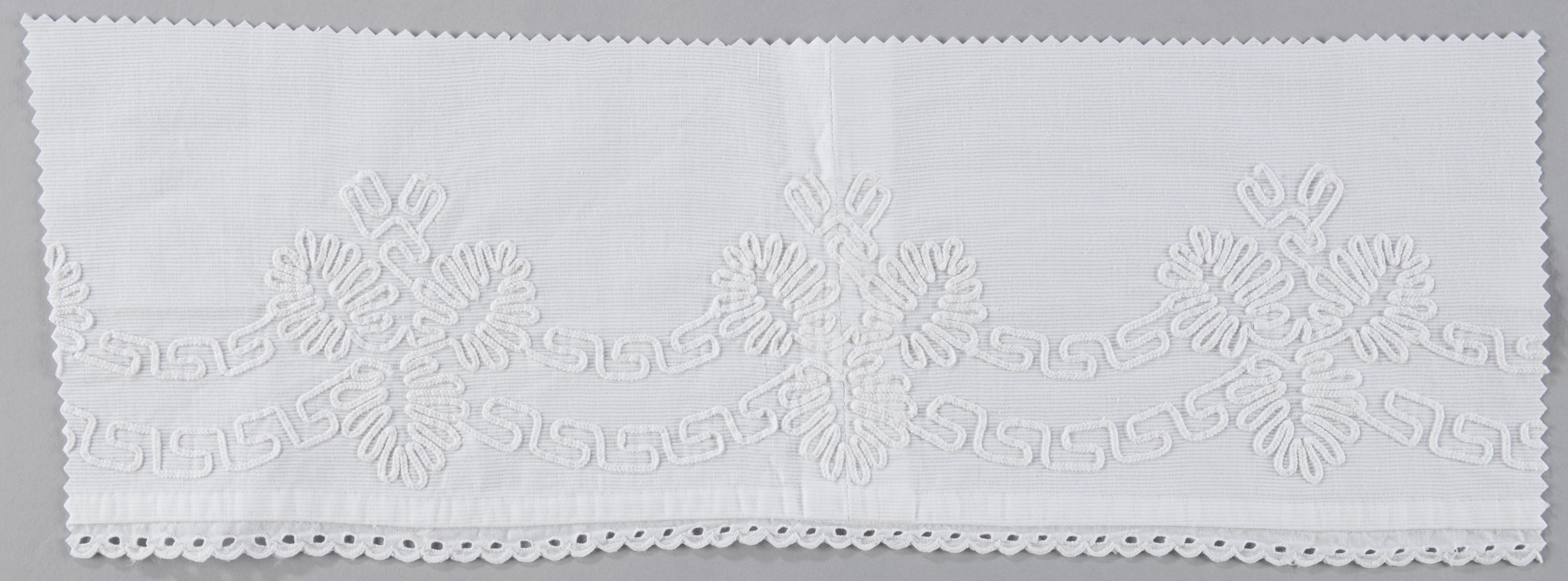 Fragment van een onderrok of kinderjurkje van witte katoenen piqué. Op de stof zijn meanderende figuren van gevlochten koord met de hand genaaid. De patroondelen van de rok of het jurkje zijn eerst met de naaimachine aan elkaar gezet voordat de versiering is aangebracht. Aan de onderzijde is een strookje broderie aangezet van circa 2 ...