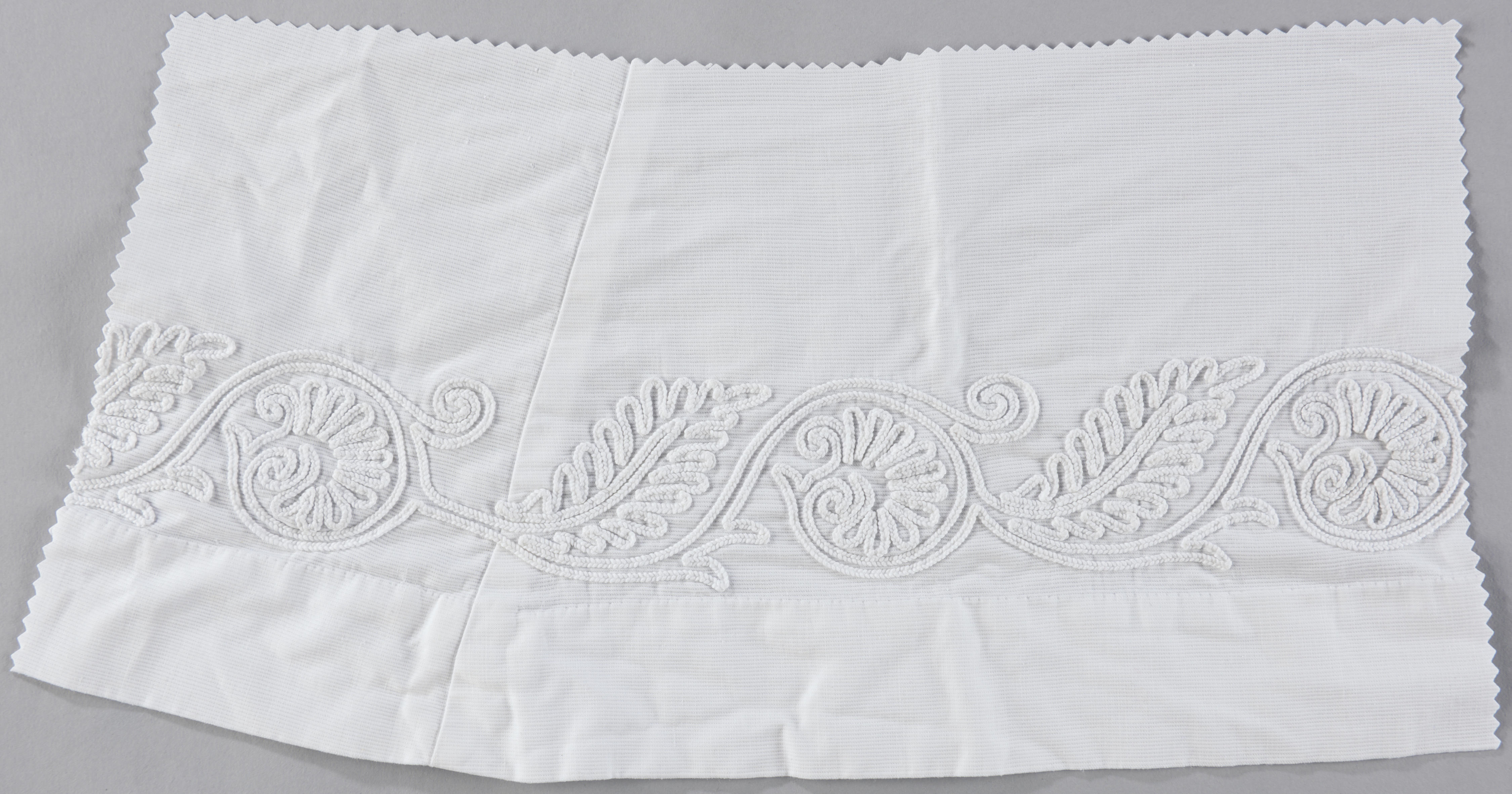 Fragment van een onderrok of kinderjurkje van witte katoenen piqué. Op de stof zijn meanderende figuren van gevlochten koord met de hand genaaid. De patroondelen van de rok of het jurkje zijn eerst met de naaimachine aan elkaar gezet voordat de versiering is aangebracht. Aan de onderzijde is met de hand een zoom van 4,5 ...