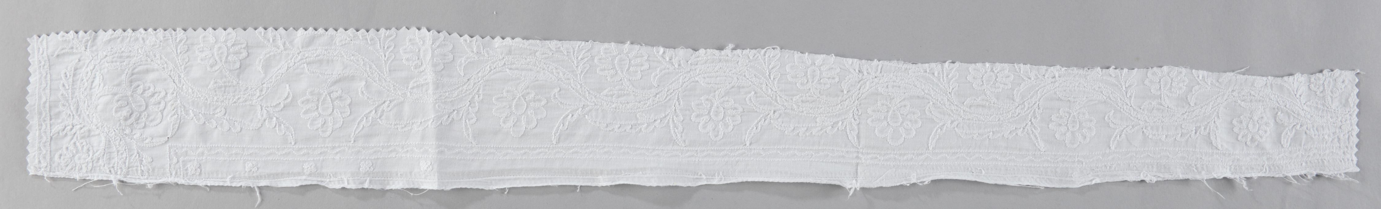 Fragment van een kledingstuk van witte katoen. Op de stof zijn met de hand bloem- en bladfiguren geborduurd met kettingsteken. Waarschijnlijk is dit fragment afkomstig van een onderrok of een kinderjurkje uit het derde of laatste kwart van de negentiende eeuw.