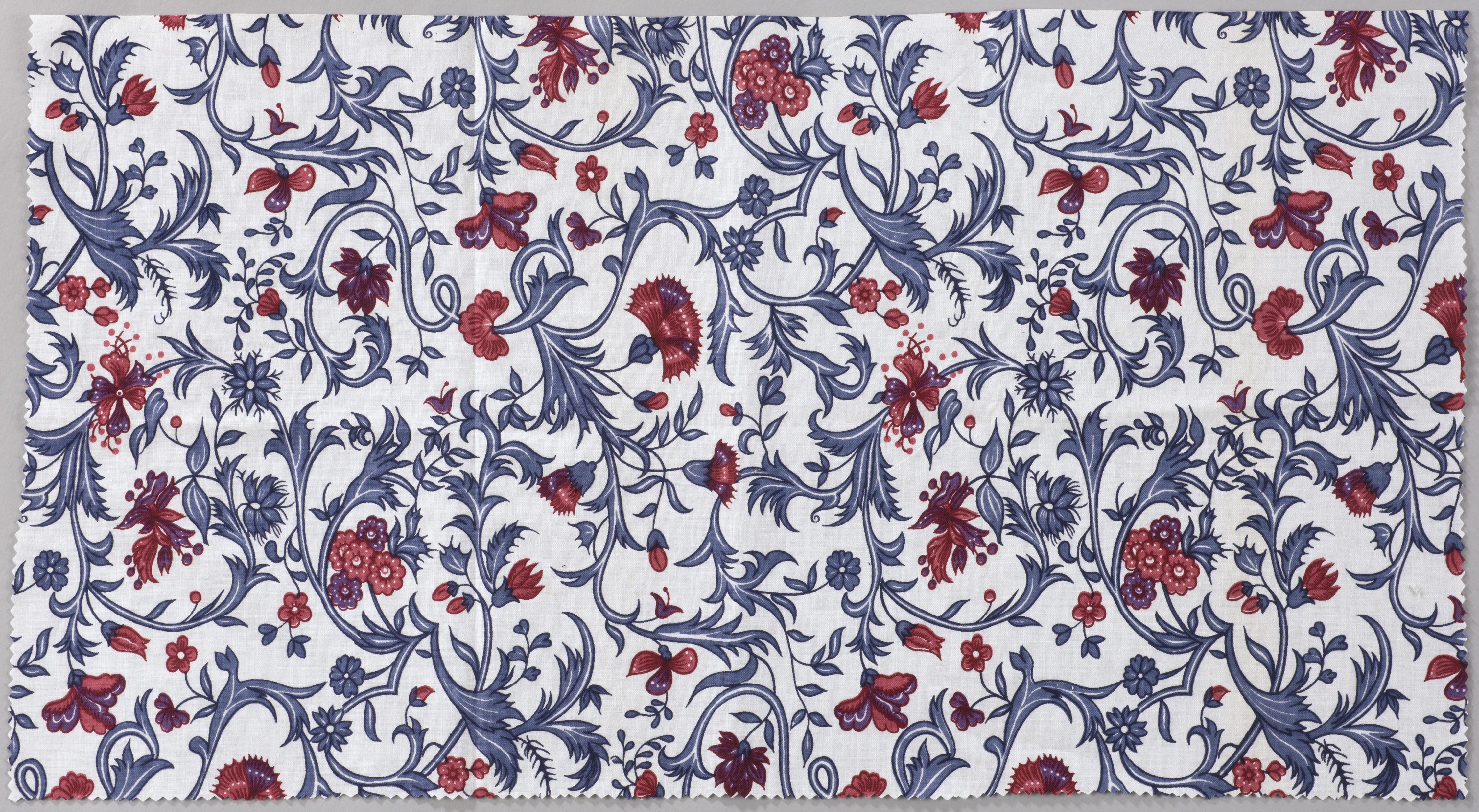 Witte katoenen stof, bedrukt met bloem- en bladmotieven. Het patroon is gebaseerd op sits. Deze stof is veelvuldig gebruikt voor replica's van kleding en interieurtextiel.