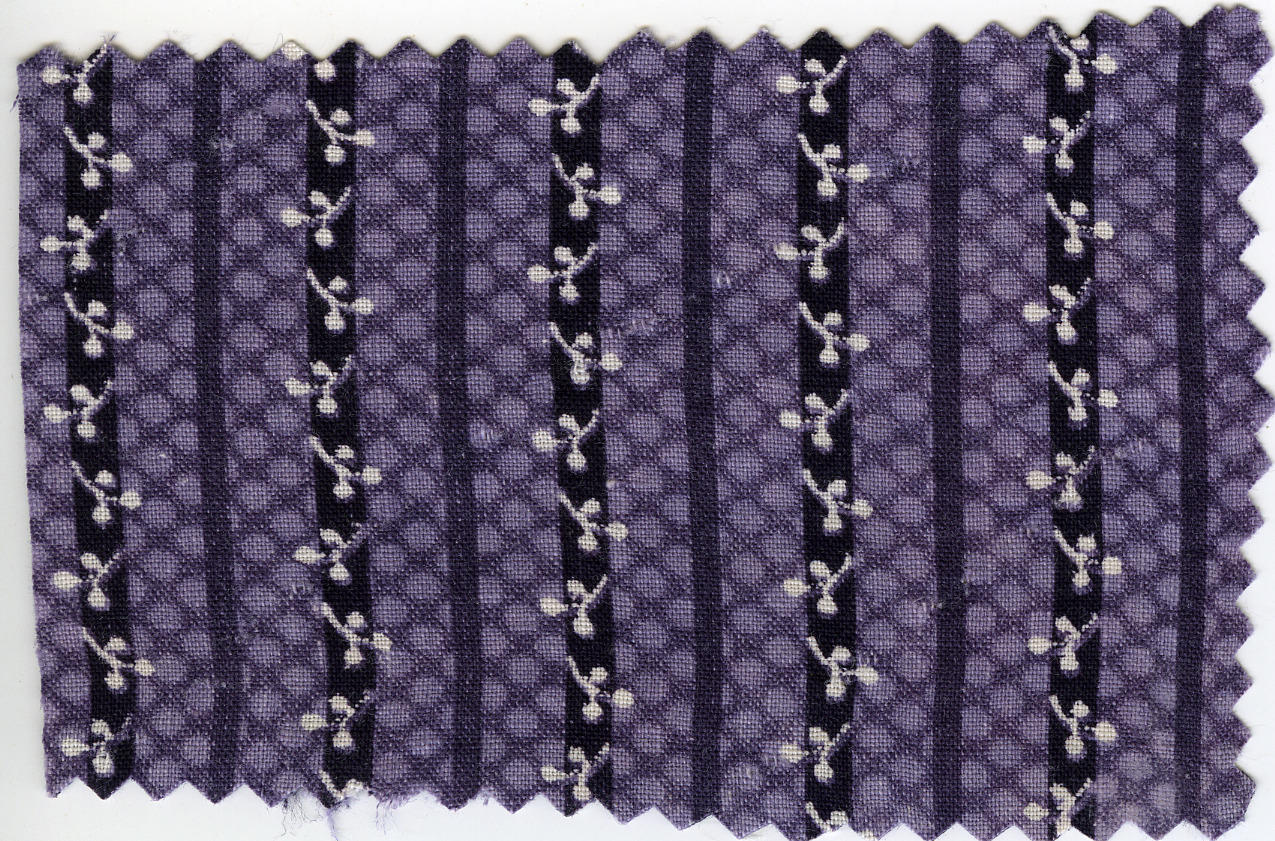Gedessineerde katoen met uitgespaarde witte motieven en bedrukt met paarse strepen. Fragment van een kraplap uit Spakenburg. Een kraplap van deze stof kan gedragen worden bij de 'vierljaarsrouw'.