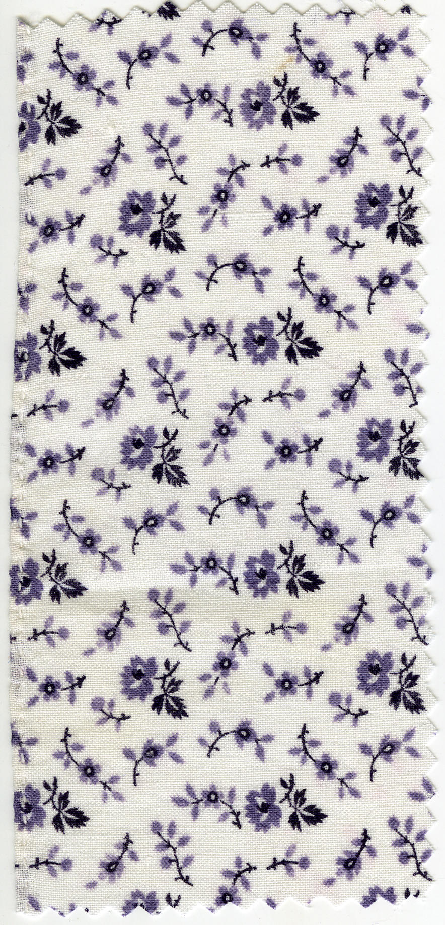 Gedessineerde katoen met een wit fond en bedrukt met paarse motieven. Deze stof is mogelijk afkomstig van een schouderdoek van de Noordwest-Veluwe of een onderdoek uit Staphorst. De doek is door de Spakenburgse eigenaresse verknipt voor een kraplap. Een kraplap van deze stof kan gedragen worden bij de 'zevenwekenrouw' (in het lokale dialect: 'zeuvenwekesrouw'). In ...