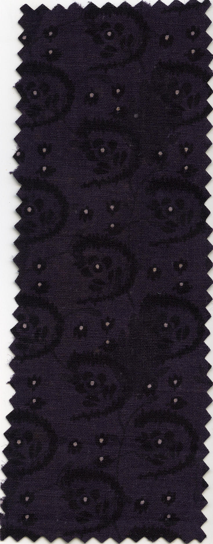 Gedessineerde katoen met een paars fond met donkerpaarse motieven en uitgespaarde witte details, afkomstig van een kraplap uit Spakenburg. De kraplap kan gedragen worden bij de zware rouw. Dit dessin wordt 'veertje' genoemd.