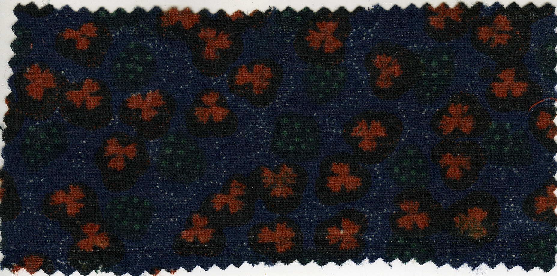 Gedessineerde katoen met een blauw fond met uitgespaarde witte motieven die deels met rood en groen zijn bedrukt, afkomstig van een jak uit Spakenburg. Dit dessin hoort tot de dessins die ter plaatse worden aangeduid als 'Gooiers korenblauw'. Het 'Gooiers korenblauw' onderscheidt zich van de andere soorten 'korenblauw' door een bepaalde kleurencombinatie. De aanduiding 'Gooiers' ...