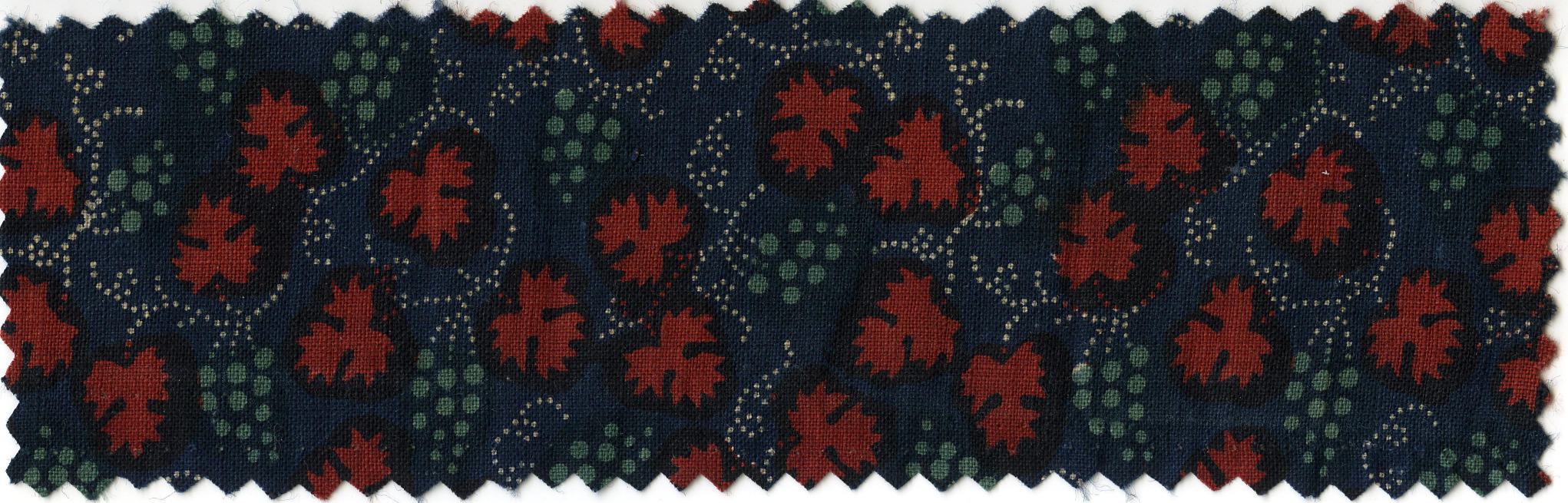 Gedessineerde katoen met een blauw fond met uitgespaarde witte motieven die deels met rood en groen zijn bedrukt, afkomstig van een jak uit Spakenburg. Dit dessin hoort tot de dessins die ter plaatse worden aangeduid als 'Gooiers korenblauw'. Het 'Gooiers korenblauw' onderscheidt zich van de andere soorten 'korenblauw' door een bepaalde kleurencombinatie. De aanduiding 'Gooiers' ...