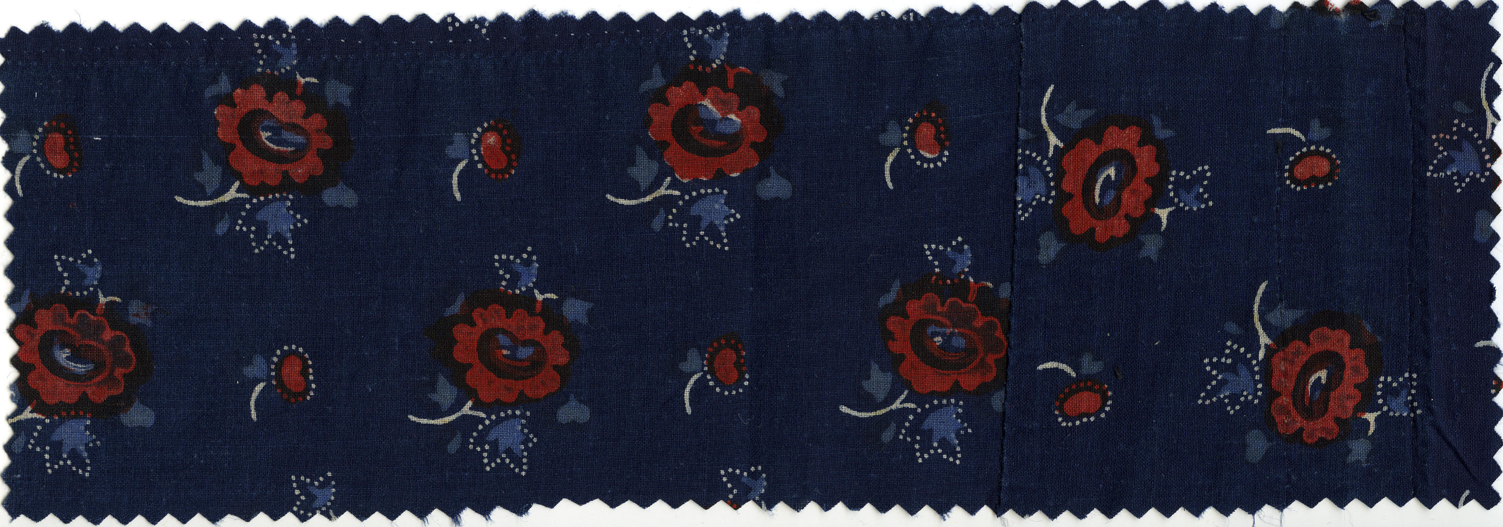 Gedessineerde katoen met een blauw fond met uitgespaarde witte en lichtblauwe motieven die deels met rood zijn bedrukt, afkomstig van een jak uit Spakenburg. Dit dessin hoort tot de dessins die ter plaatse worden aangeduid als 'Gooiers korenblauw'. Het 'Gooiers korenblauw' onderscheidt zich van de andere soorten 'korenblauw' door een bepaalde kleurencombinatie. De aanduiding 'Gooiers' ...