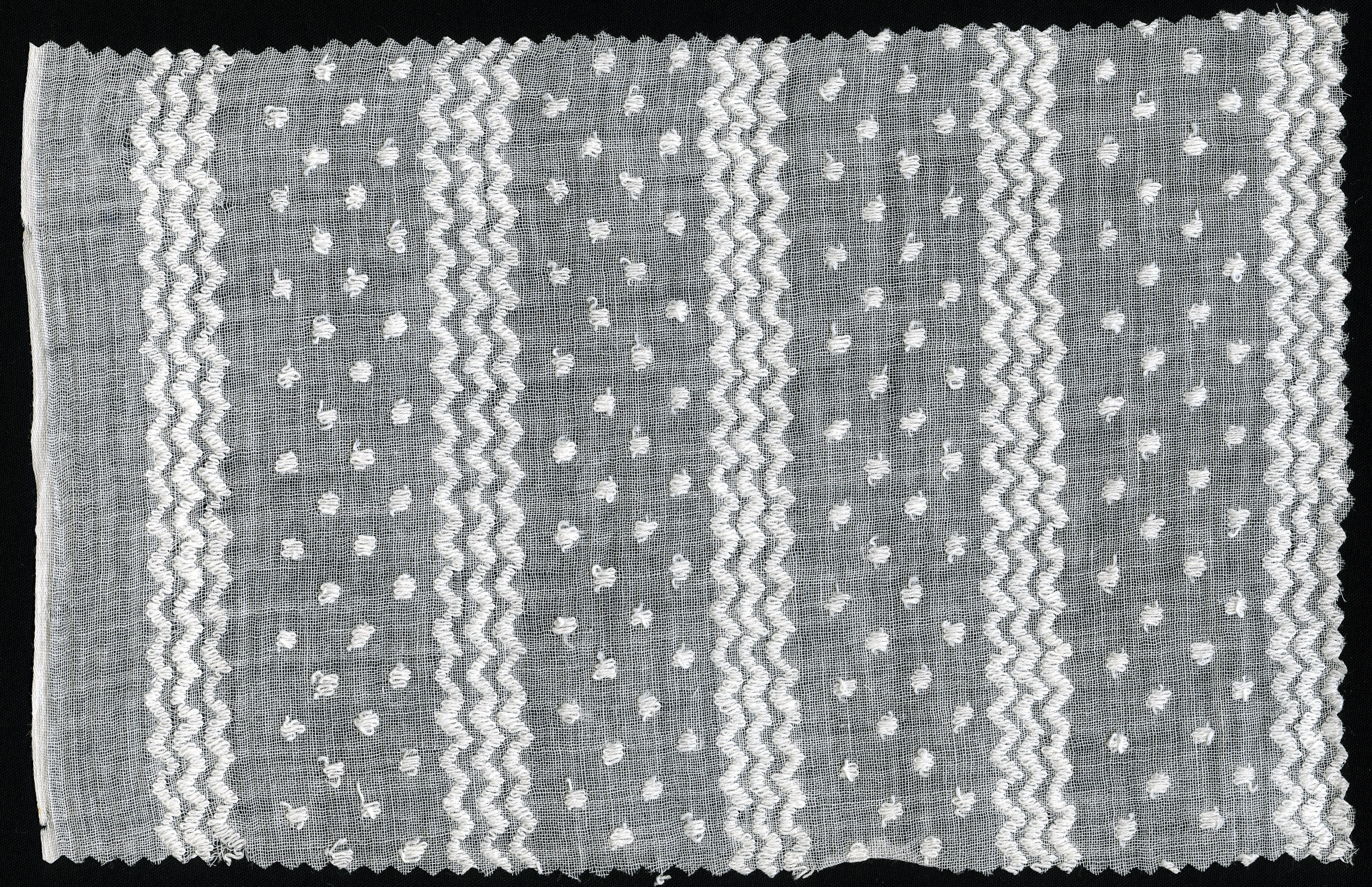 Machinaal geweven stof, gemaakt van gebrocheerde katoenen garens. Dergelijke stoffen komen vanaf de achttiende tot aan het begin van de twintigste eeuw voor. Ze werden geweven met speciale getouwen. Dit fragment is een machinale imitatie van witborduurwerk. Het is moeilijk te dateren, maar is vervaardigd na het midden van de negentiende eeuw. Dit soort stoffen ...