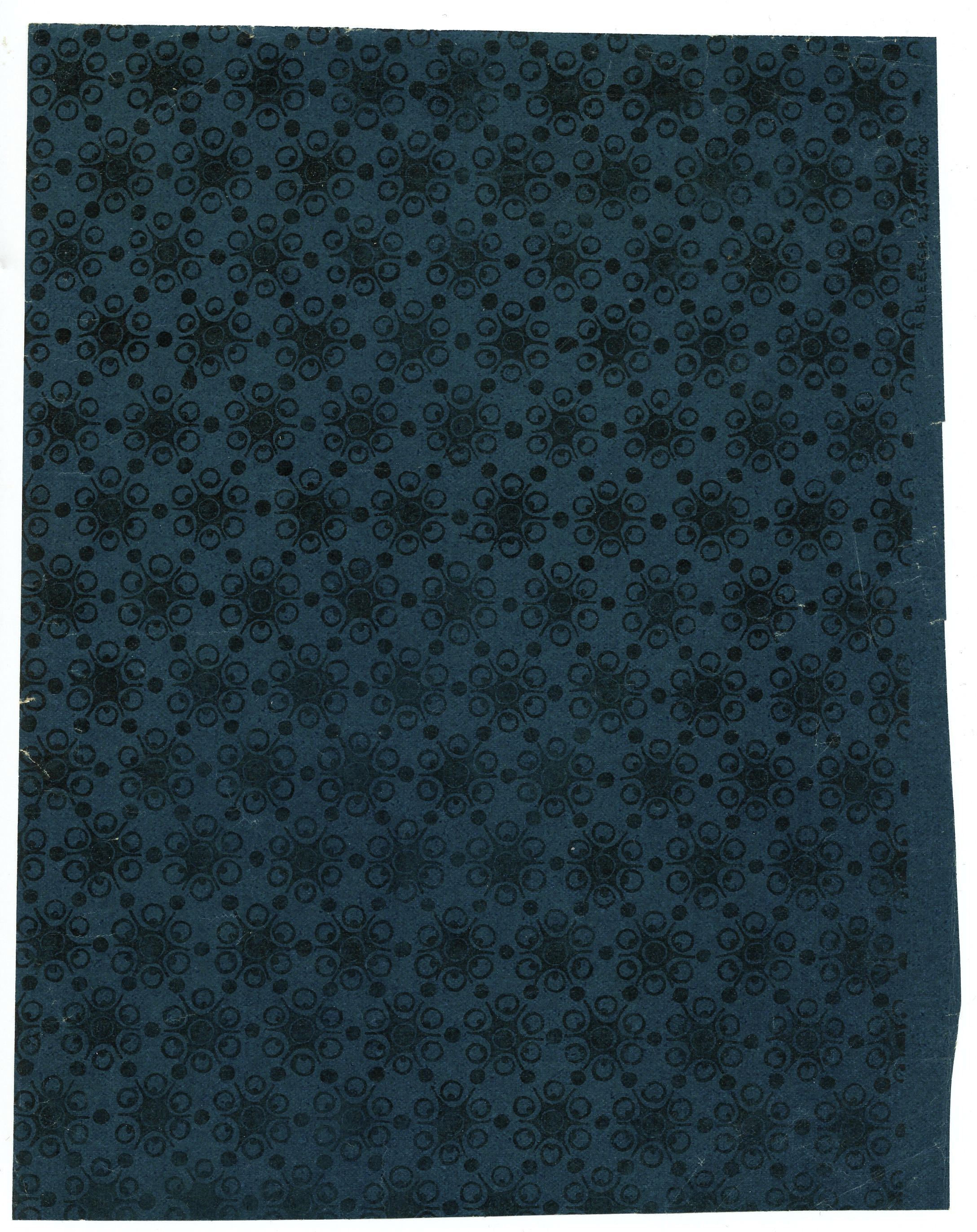 Een stuk blauw sitspapier, bedrukt met een zwart dessin.