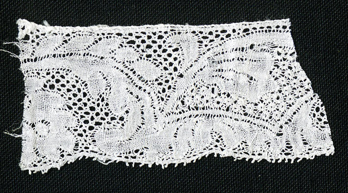 Strook Valenciennes kloskant. Het rapport van het patroon is niet compleet. De grond is een zogenoemde 'vijfgaatjesgrond'. De vlakvulling in de motieven bestaat uit zogenoemde 'eksteroogjes'. De stof is onder meer gebruikt in de Marker streekdracht, als afwerking van de witte schouderdoeken.