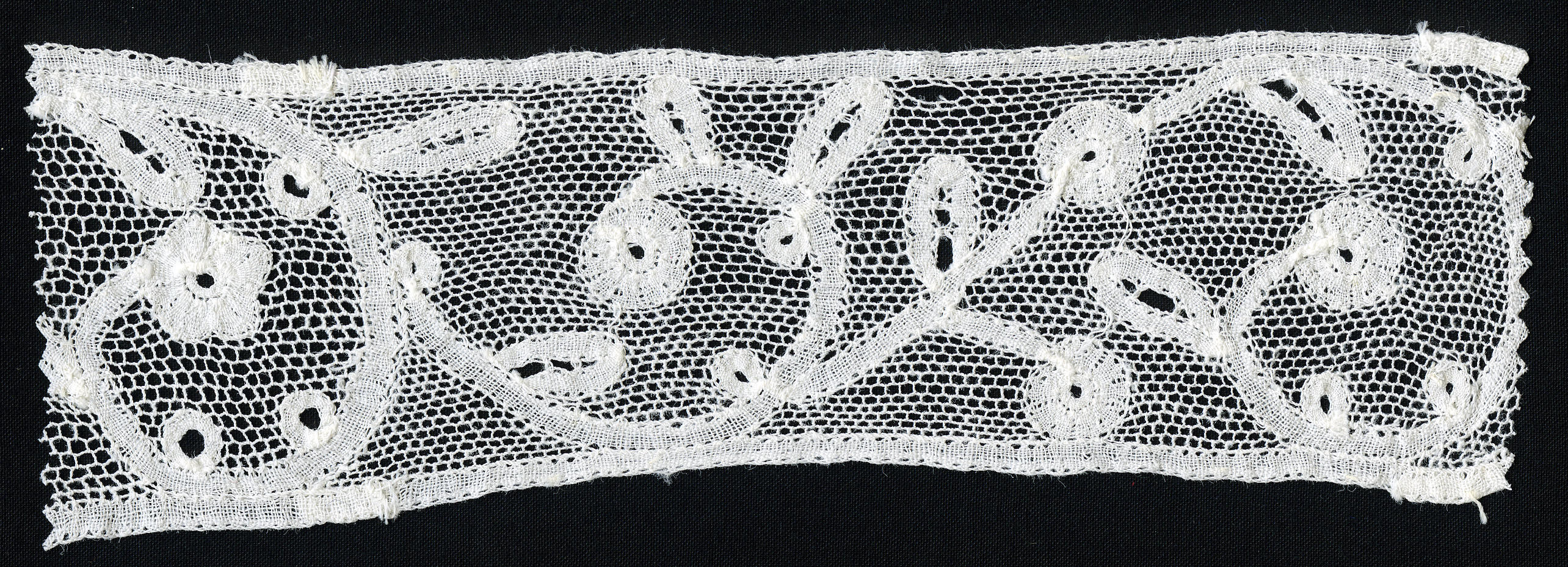 Strook Vieux Flandre, afkomstig van een manchet. De motieven worden gevormd door geklost lint. De openingen zijn met naaldkantmazen opgevuld. Behalve voor kleding is het kant ook als afwerking van interieurtextiel gebruikt, bijvoorbeeld aan lopers en tafelkleden. Het rapport is circa zestien centimeter.