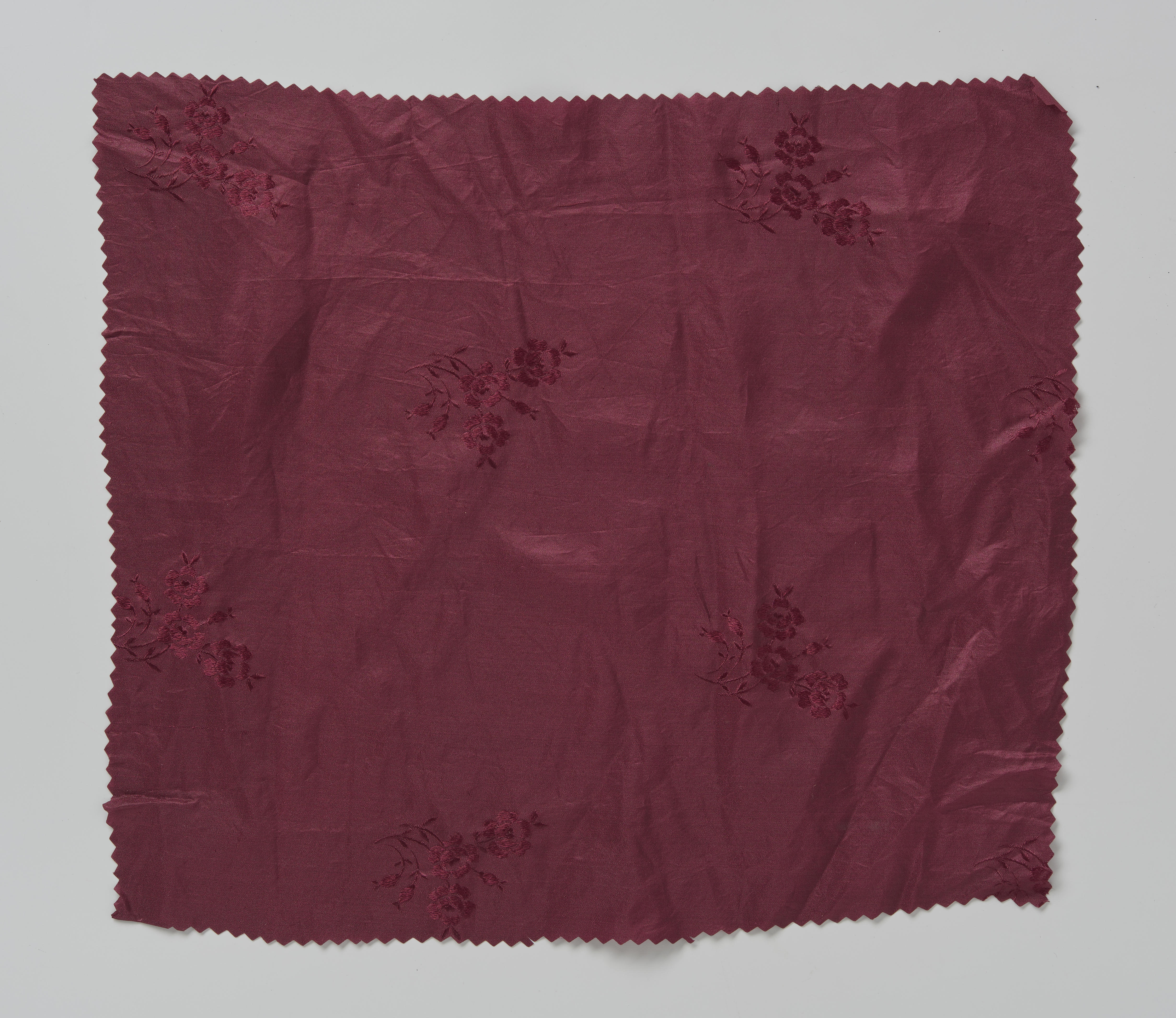 Stuk donkerrode zijde, afkomstig van een japon. Doordat de zijde verzwaard is met metaalzouten is de stof erg fragiel. Dergelijke sterk verzwaarde zijde stamt dikwijls uit het eind van de negentiende of het begin van de twintigste eeuw. Het via een chemisch proces verzwaren van zijde werd gedaan om een zwaardere en luxere kwaliteit zijde ...