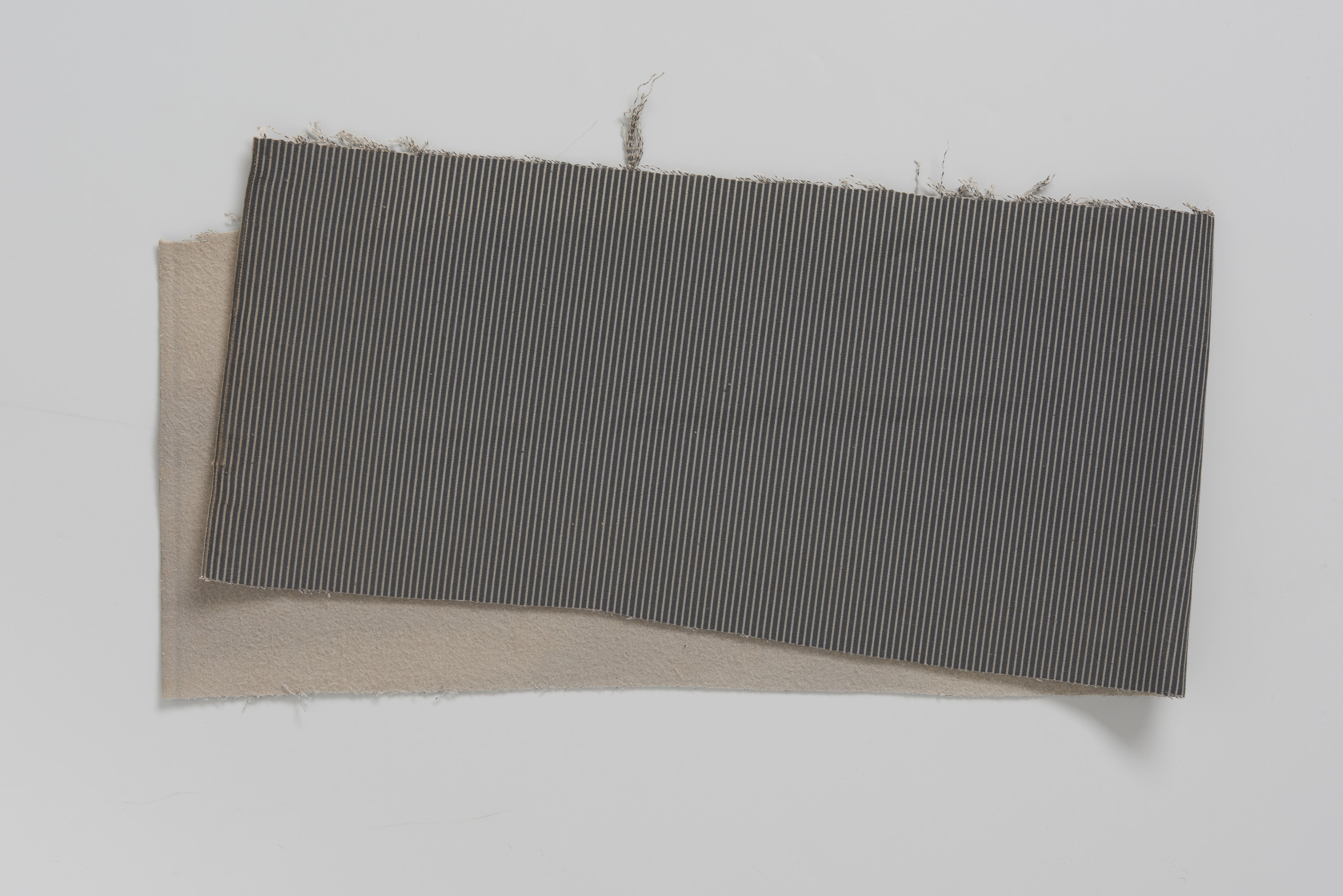 Stevige katoenen stof. De stof is grijs van kleur en bedrukt met donkergrijze strepen. De achterzijde is geruwd. Op de achterzijde is twee keer een groene stempel met een duivelskop en de tekst 'duvelssterk' aangebracht. De weefbreedte is 77 centimeter.
