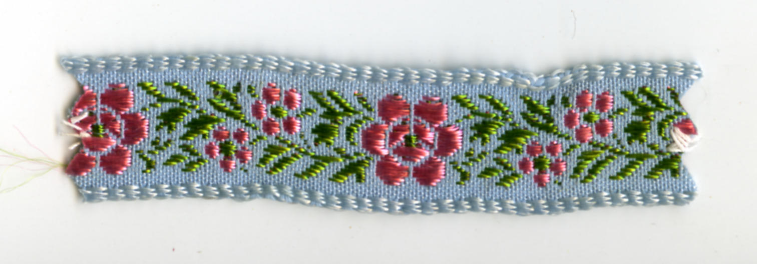 Lichtblauw band met ingeweven roosmotieven, gebruikt als decoratie op een Walcherse 'beuk' (kroplap).