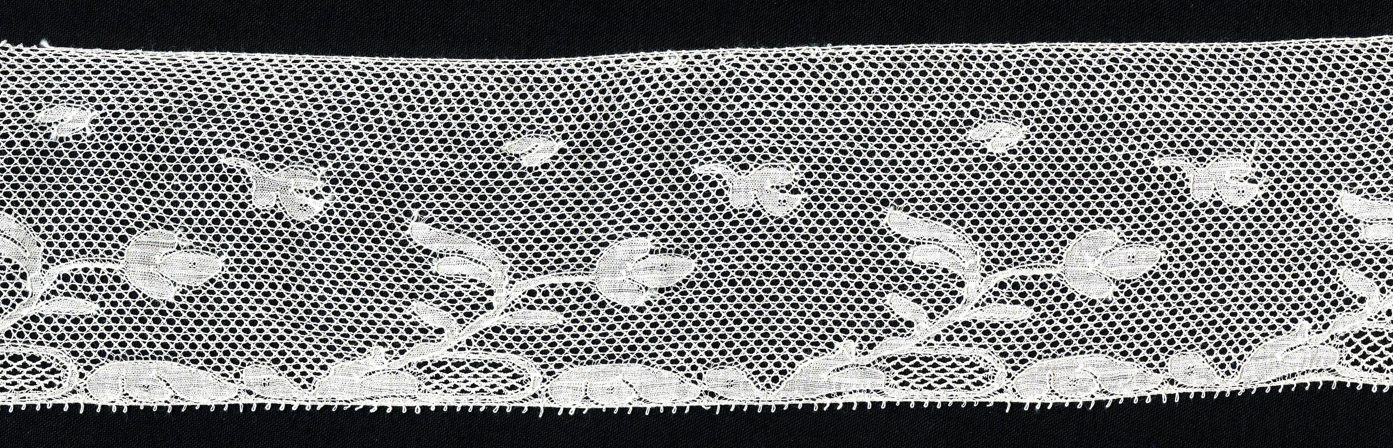 Strook machinale kant in de stijl van Parijse kloskant. De contourdraad ligt aan één zijde van de kant. Hij is aan beide zijden van de motieven afgeknoopt en niet bij ieder motief opnieuw ingelegd. De picots zijn erg regelmatig. Het rapport is ongeveer 8 centimeter.