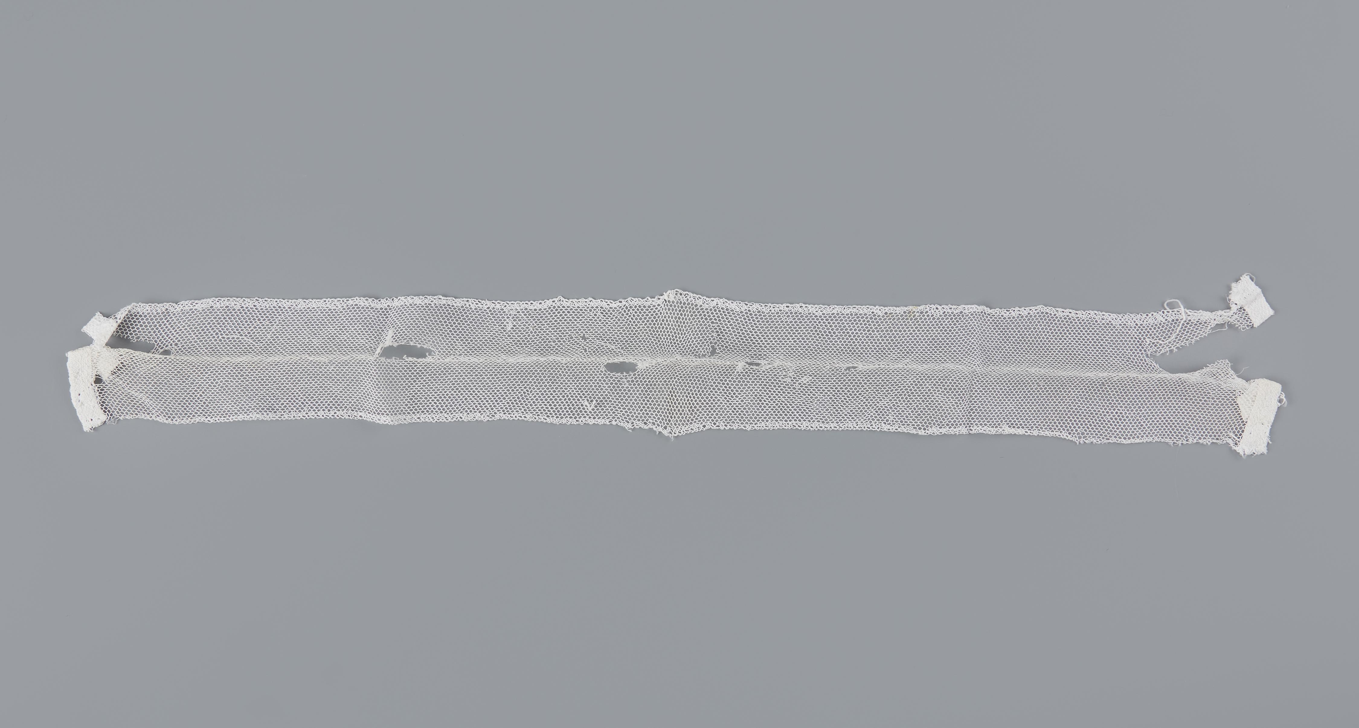 Dubbelgenomen strook machinale tule, afkomstig van een hul die gedragen is door een vrouw in streekdracht uit Volendam. Deze strook zat onderaan de bol. Hierdoor werden twee bandjes gehaald waarmee de muts op de juiste maat werd getrokken.