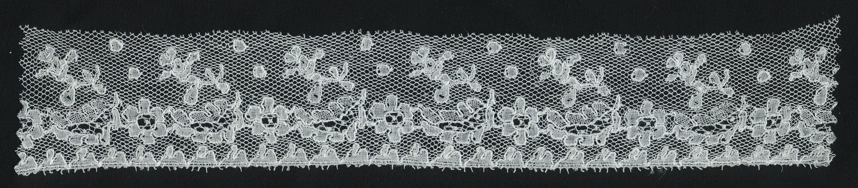 Strook machinale kant, met een rapport van 3,5 centimeter. De bovenrand ontbreekt. De strook komt mogelijk van de fijngeplooide voorstrook of de achterstrook van een kornetmuts. Hij is afkomstig uit de nalatenschap van Aaltje Romijn-Verschoor (1876-1955). Aaltje droeg de streekdracht van het Land van Altena vanaf haar vijftiende. Ze woonde achtereenvolgens in Almkerk en Dussen.