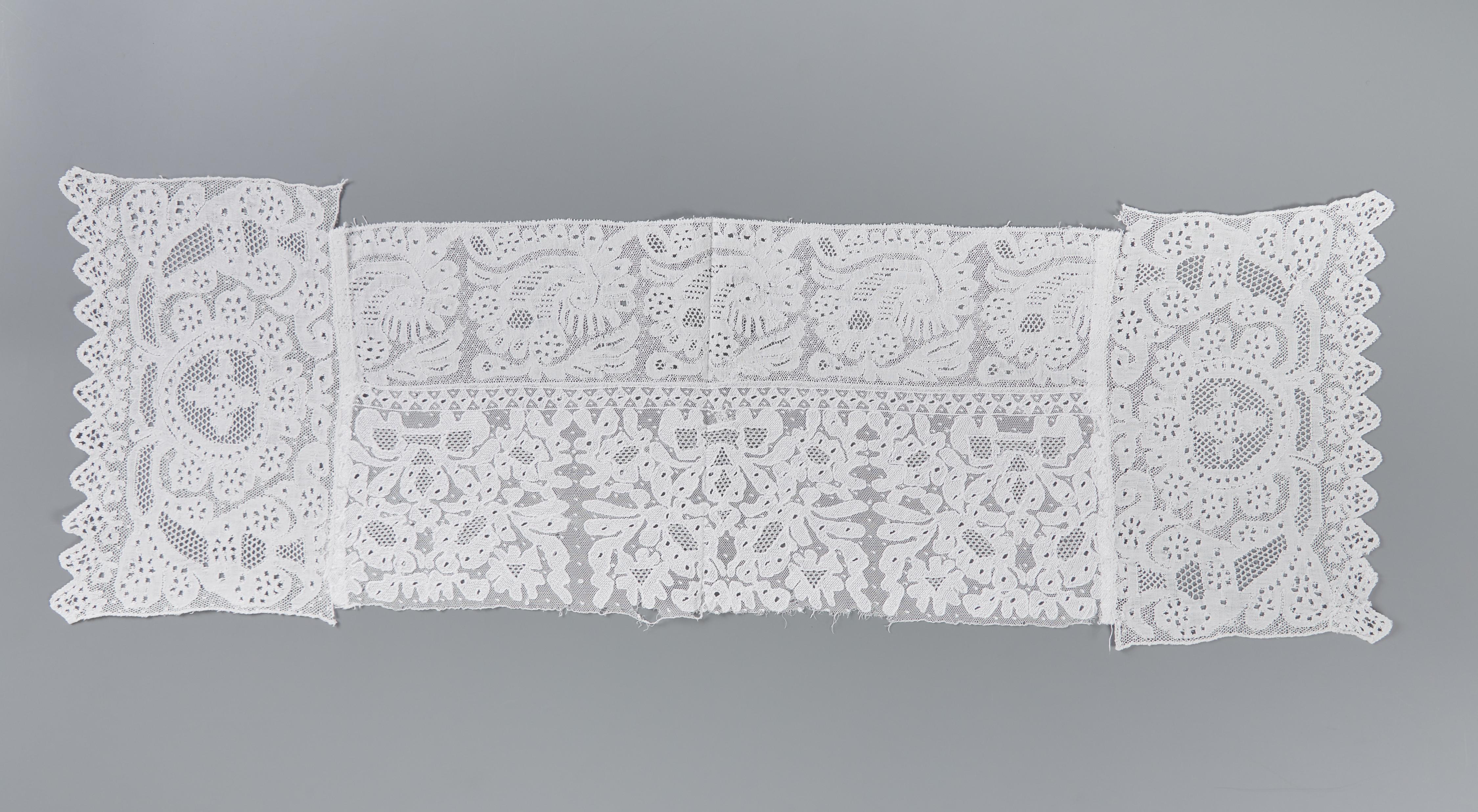 Fragment van een katholieke Zuid-Bevelandse vrouwenmuts. Het fragment bestaat uit een zogenoemde pluumkant, een 'reep' of 'kant' en aan beide zijden een zogenoemd 'zijstuk' of 'onderkant'. De katholieke Zuid-Bevelandse vrouwenmuts bestaat uit verschillende onderdelen. Aan de 'achtermuts' van effen batist of fijne katoen worden drie kantstroken gezet, achtereenvolgens de 'pluumkant', de 'reep' of 'kant' en ...
