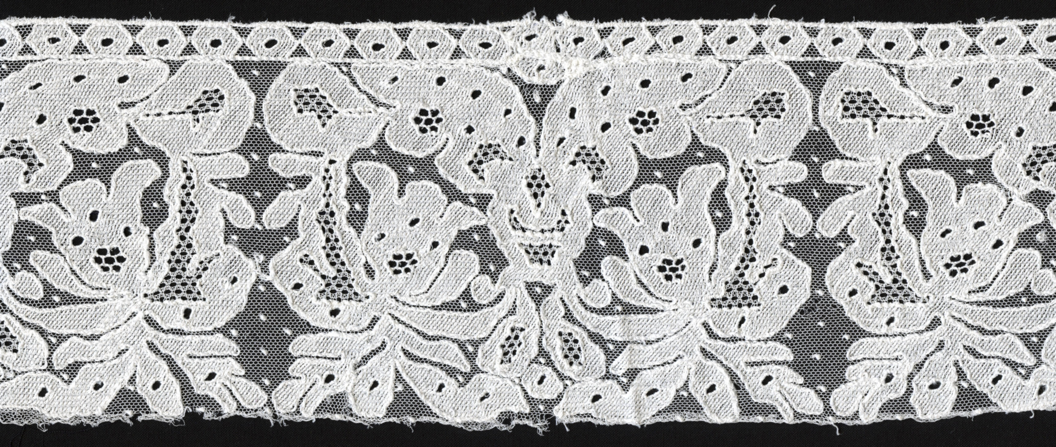 Een zogenoemde 'pluumkant' van een katholieke Zuid-Bevelandse vrouwenmuts. De katholieke Zuid-Bevelandse vrouwenmuts bestaat uit verschillende onderdelen. Aan de 'achtermuts' van effen batist of fijne katoen worden drie kantstroken gezet, achtereenvolgens de 'pluumkant', de 'reep' of 'kant' en de 'punt'. Langs de korte kant van deze drie kantstroken komt aan weerszijden een 'zijstuk' of 'onderkant'. Deze ...