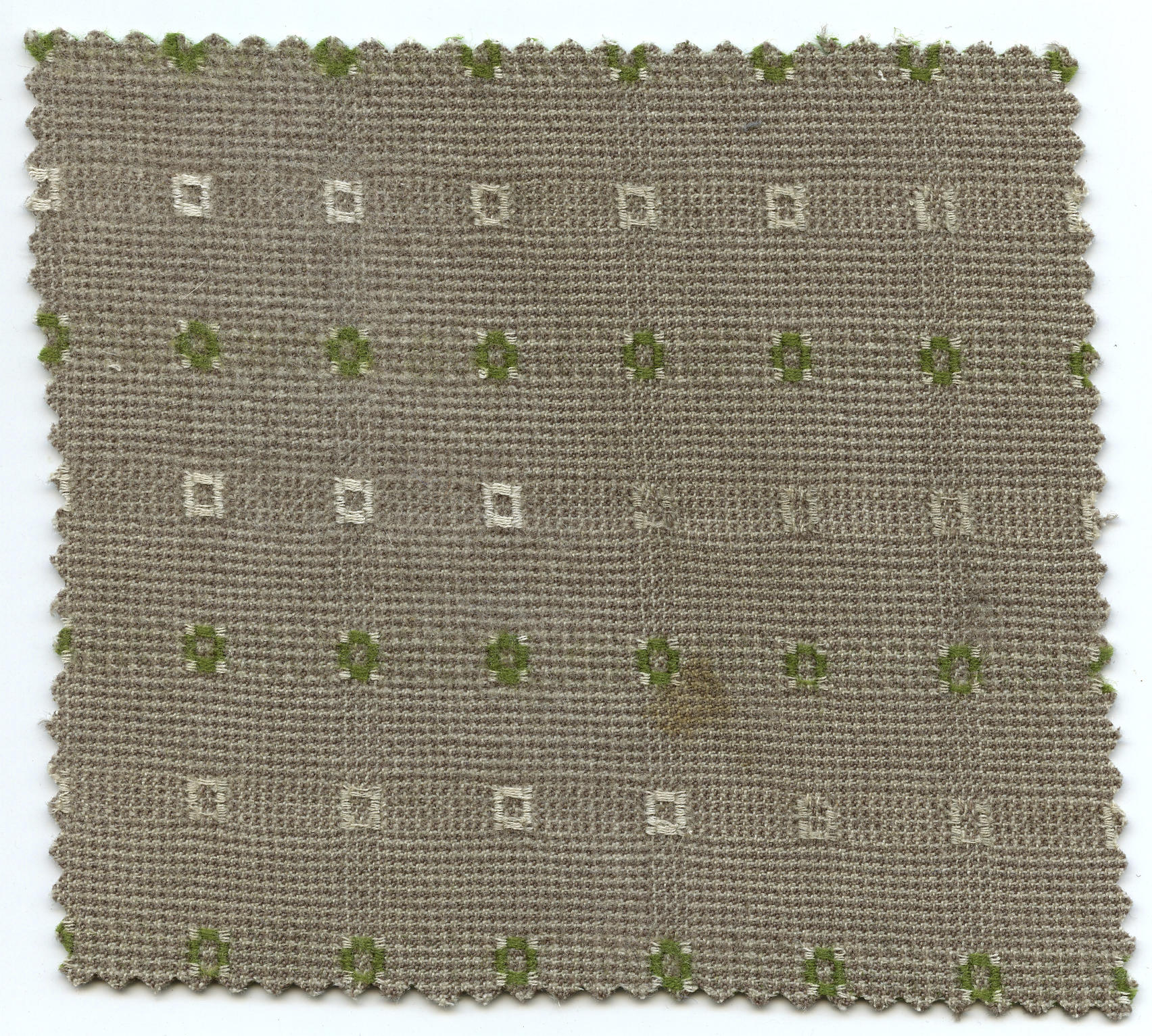 Machinaal geweven grijsbeige wollen stof met ingeweven witte en groen-witte motiefjes. De stof is gebruikt door vrouwen en meisjes in Zuid-Bevelandse streekdracht voor schouderdoeken, de zogenoemde 'broekedoeken'. De broekedoeken met afstekende ingeweven patroontjes werden met name in de periode 1930-1940 gedragen. Katholieke vrouwen droegen soms een doek en een beuk van dezelfde broekedoekenstof.