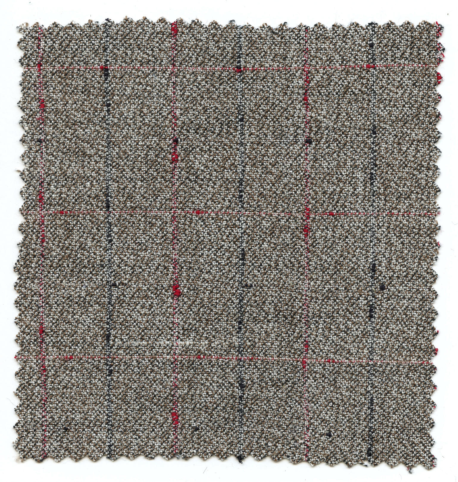 Machinaal geweven katoenen stof, bruin-crème-zwart gemêleerd, met ingeweven ruiten in rood en zwart. De stof is vanaf omstreeks 1940 gebruikt voor 'beuken' (kroplappen) en schouderdoeken door vrouwen en meisjes in Zuid-Bevelandse streekdracht.