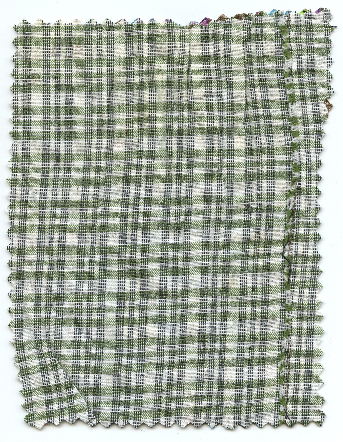 Bedrukte katoen, gebruikt voor schouderdoeken en 'beuken' (kroplappen) en vanaf omstreeks 1950 gedragen bij de daagse dracht door vrouwen en meisjes in Zuid-Bevelandse streekdracht. Tegen de achterzijde zit een stuk van de voering die genomen is van een afgedankte doordeweekse schort van geruite katoen.