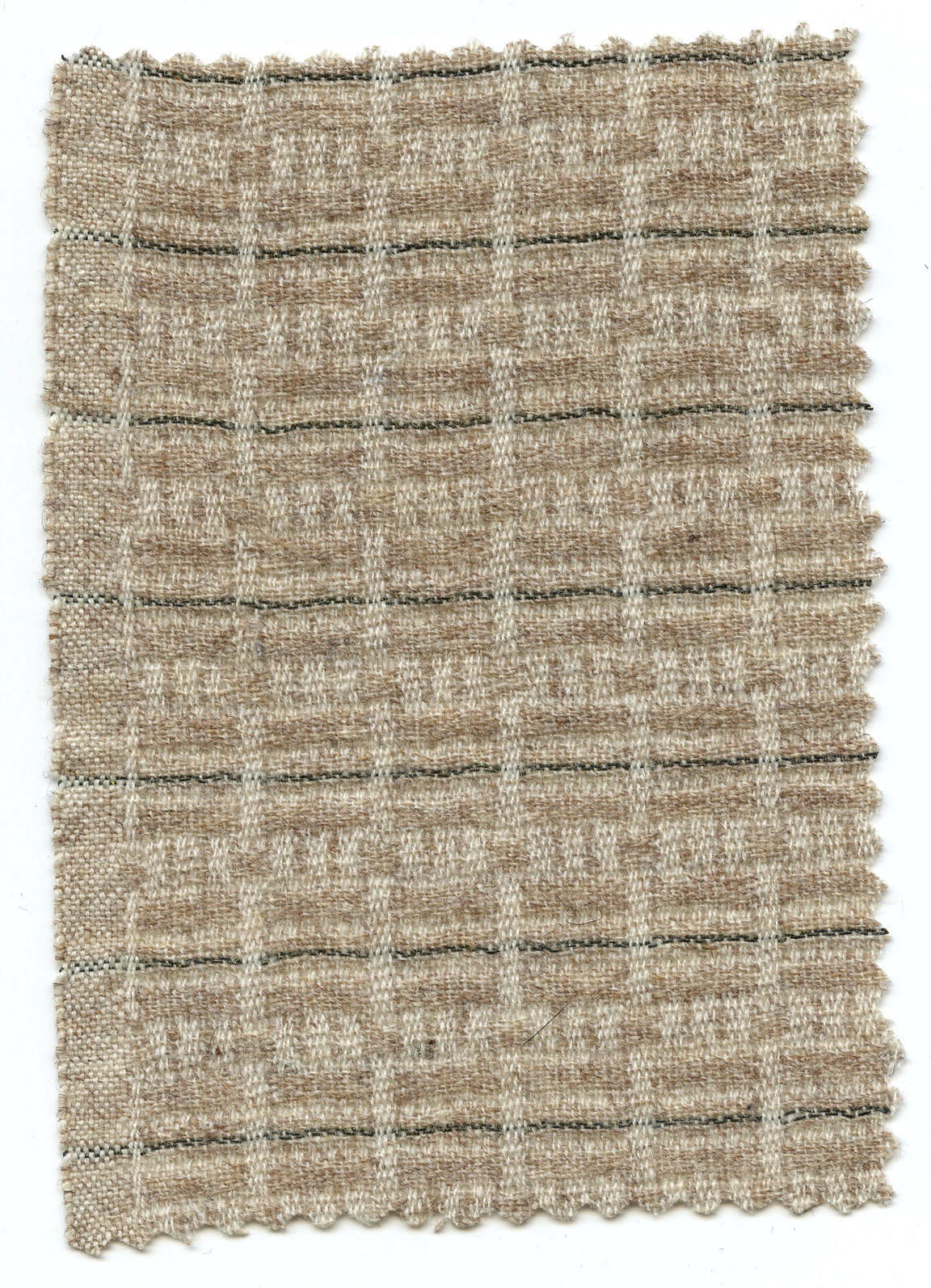 Machinaal geweven wollen stof, lichtbruin-crème-zwart geruit, gebruikt voor 'beuken' (kroplappen) en schouderdoeken door vrouwen en meisjes in Zuid-Bevelandse streekdracht.