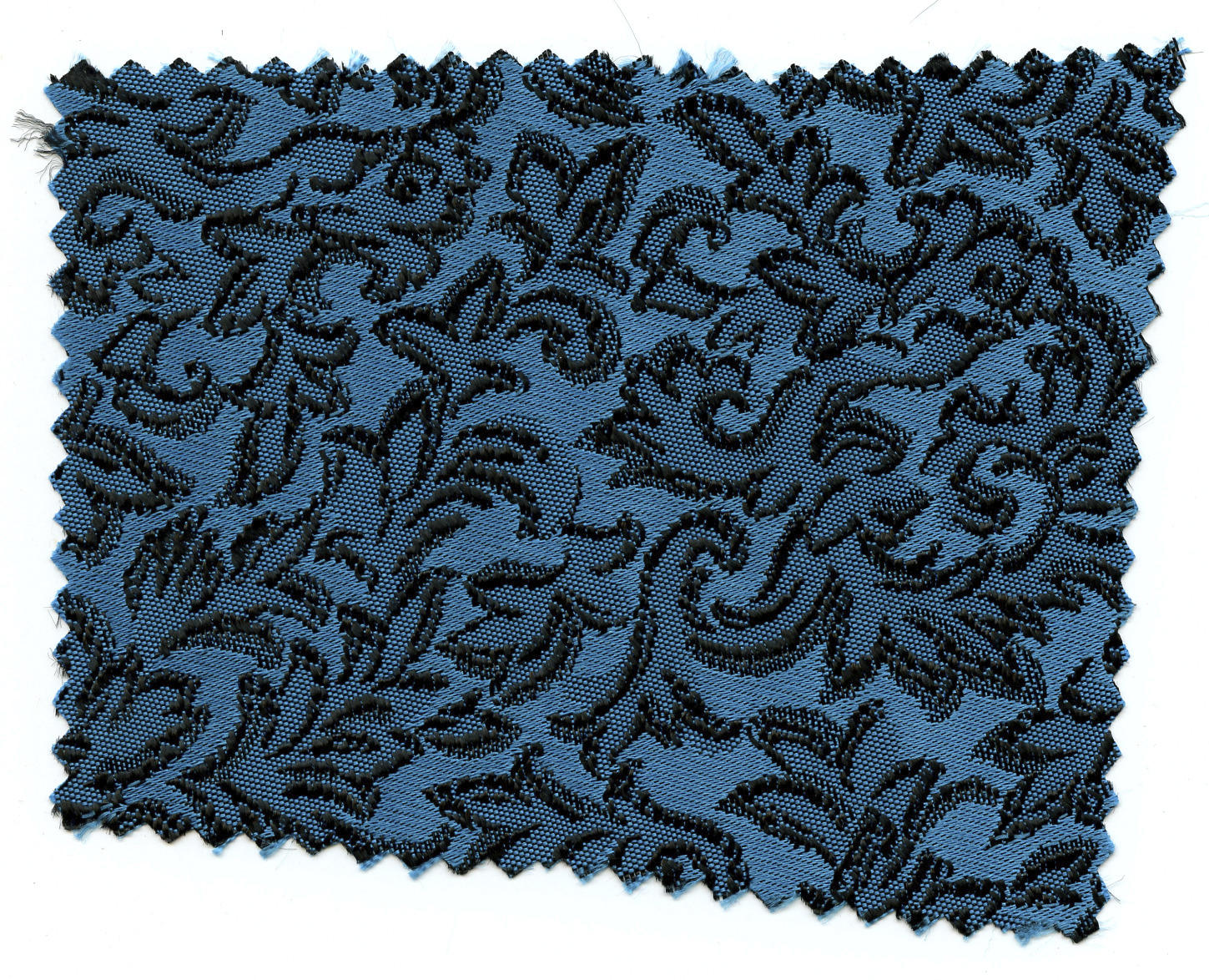 Kunstvezel jaquardstof met een blauw fond en ingeweven zwarte motieven, na omstreeks 1950 gebruikt voor 'beuken' (kroplappen) en schouderdoeken bij de zondagse dracht door vrouwen in Zuid-Bevelandse streekdracht.