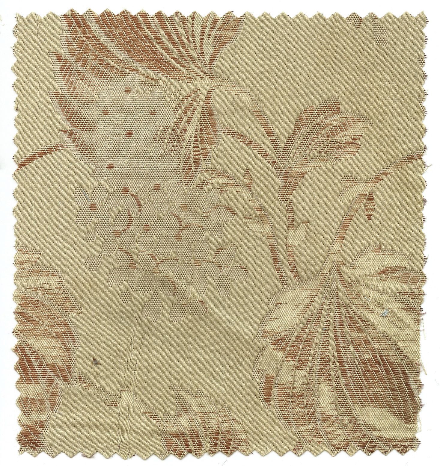 Crème zijden stof met ingeweven crème en bruine motieven, afkomstig van een zogenoemde beuk (kroplap) of schouderdoek die omstreeks 1900-1910 is gedragen door een meisje of vrouw in Zuid-Bevelandse streekdracht.