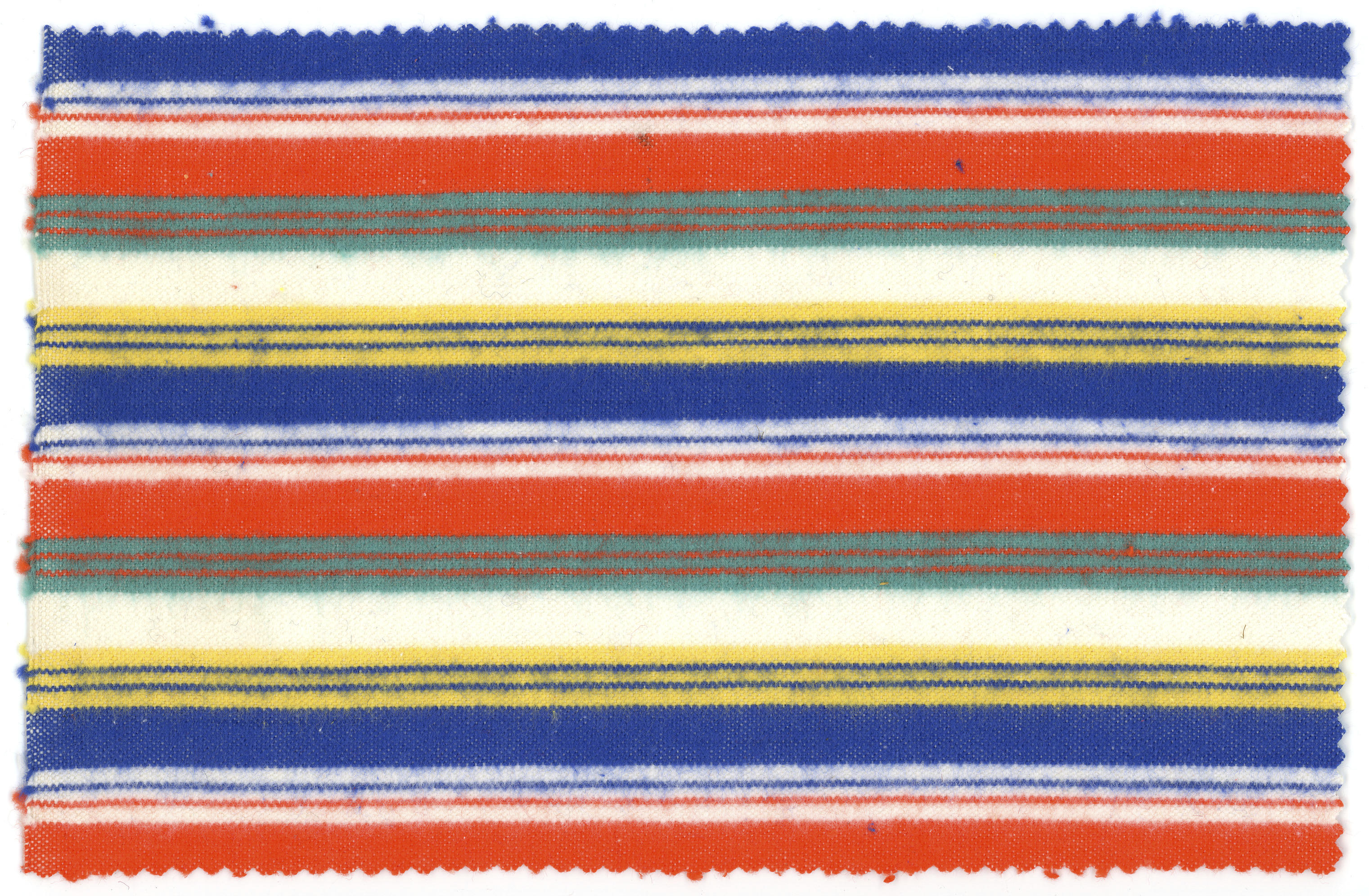 Katoenen flanel met ingeweven strepen in de kleuren oranje, wit, blauw, geel en groen. De stof is in diverse streekdrachten gebruikt voor onderrokken. Het rapport is circa 6,5 centimeter.