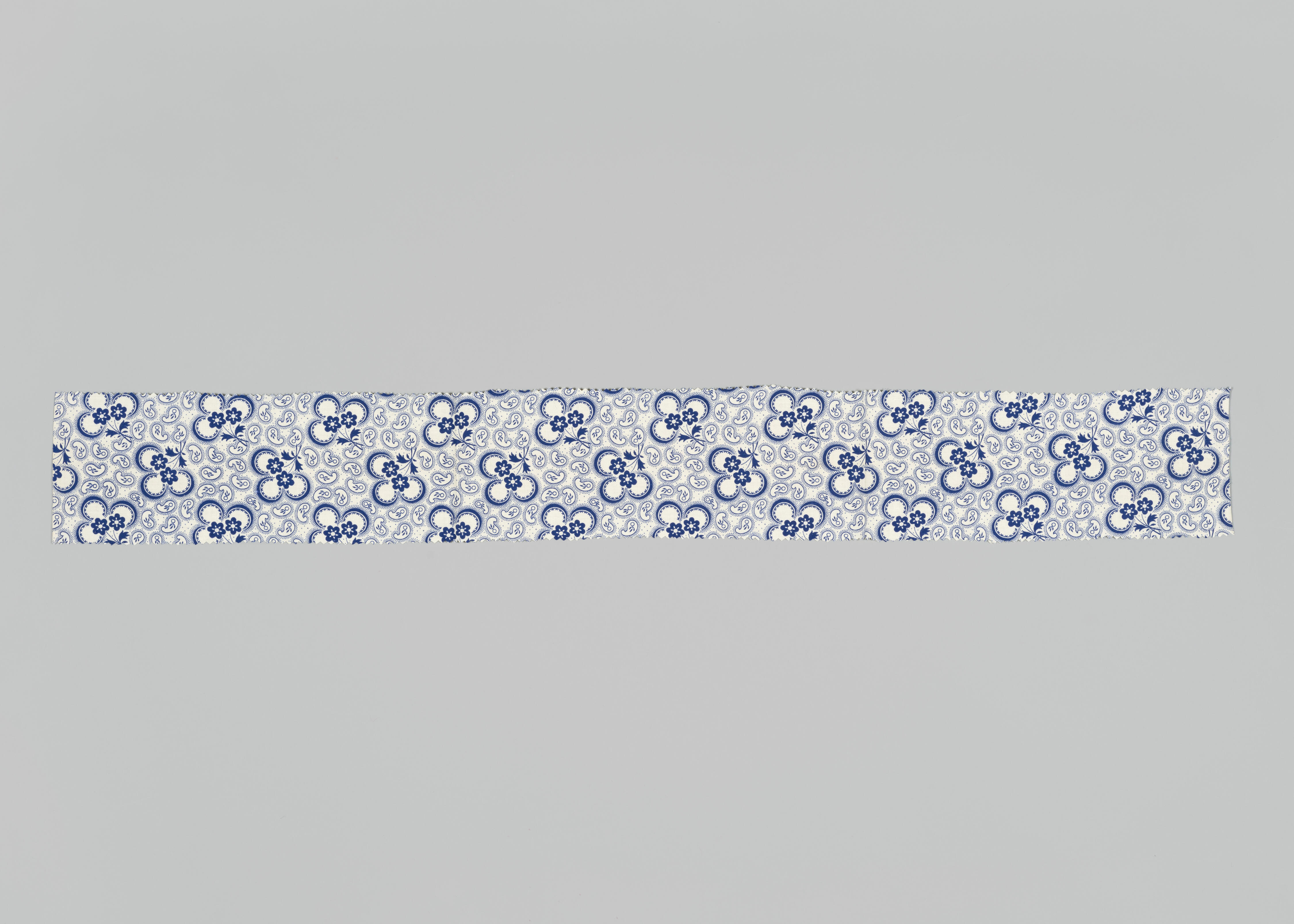Een stuk wit katoen, bedrukt met een blauw dessin. Deze stof is algemeen gebruikt voor kussenslopen. Het dessin komt in verschillende kleuren voor. De stof is geweven in platbinding. De weefbreedte is 80 centimeter.