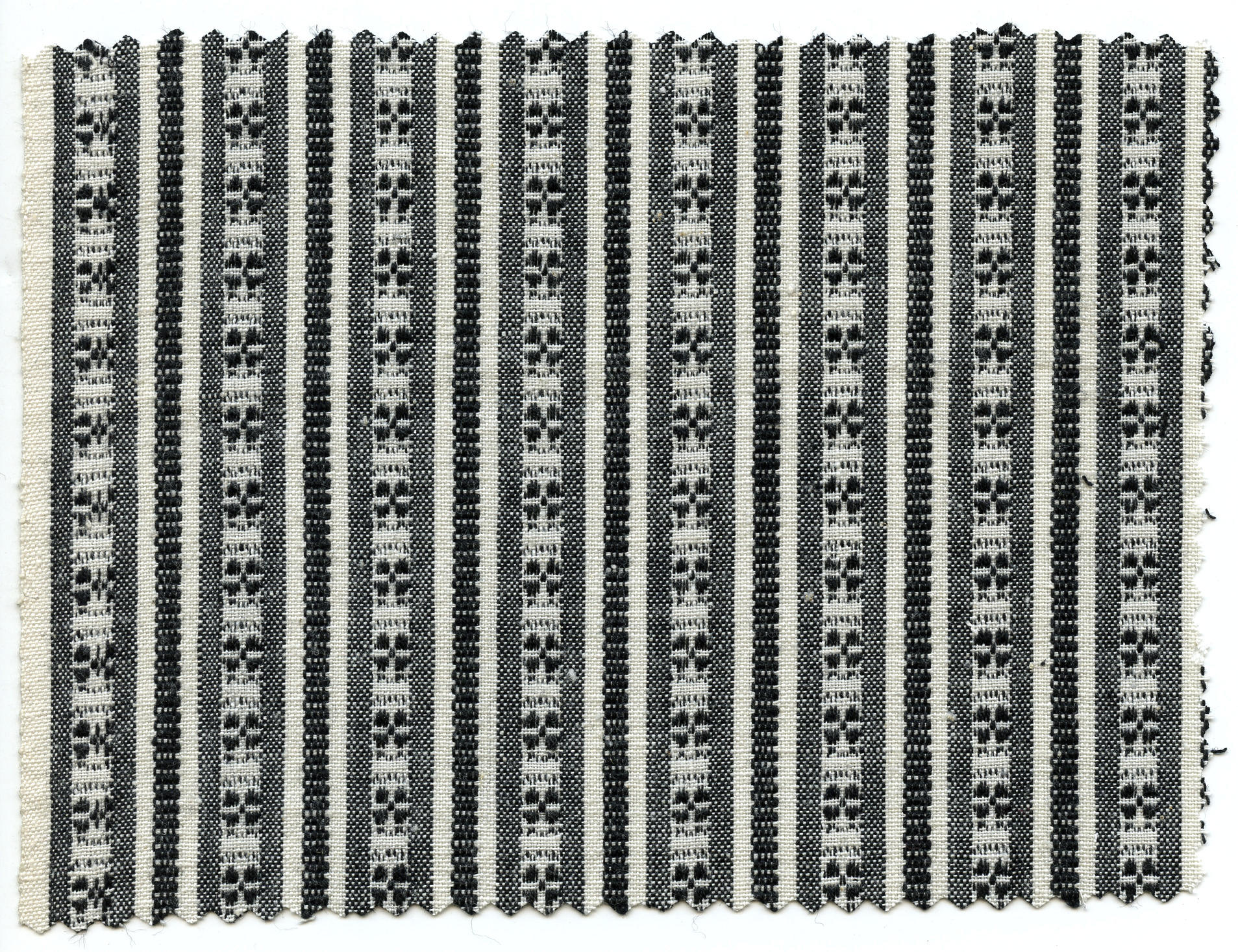 Machinaal geweven katoenen stof, zogenoemd schortenbont of Zeeuws bont. De stof heeft witte en zwarte kettingdraden met witte inslagdraden, in patroon geweven. Hij is gebruikt voor doordeweekse schorten door vrouwen in Walcherse streekdracht. Als de vrouw in de rouw is, kiest ze een patroon met meer zwart dan wanneer ze niet in de rouw is. ...