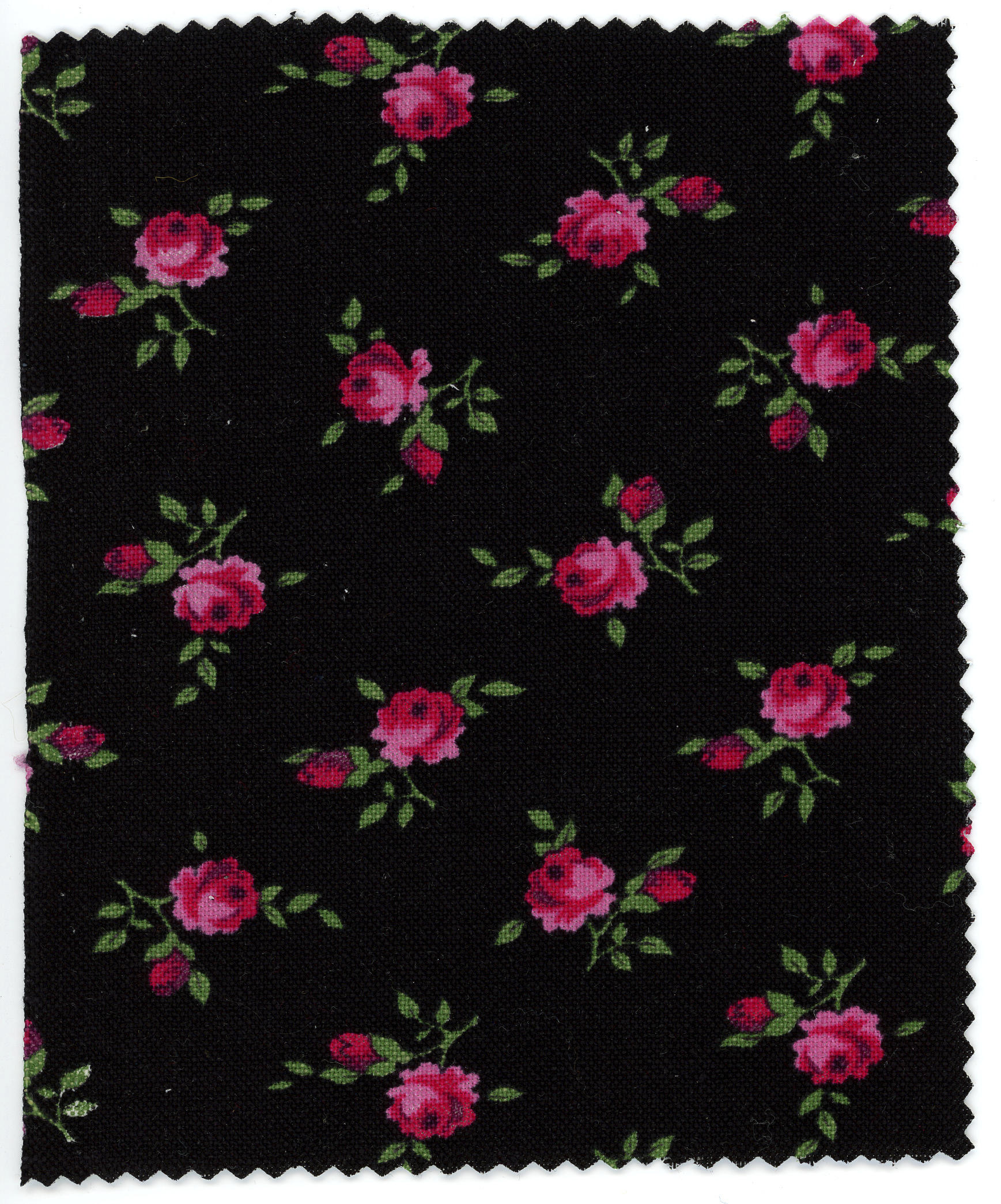 Stuk katoen, geweven in platbinding, bedrukt met rood-groene motieven op een zwart fond. De stof is in Staphorst gebruikt voor daagse kraplappen.