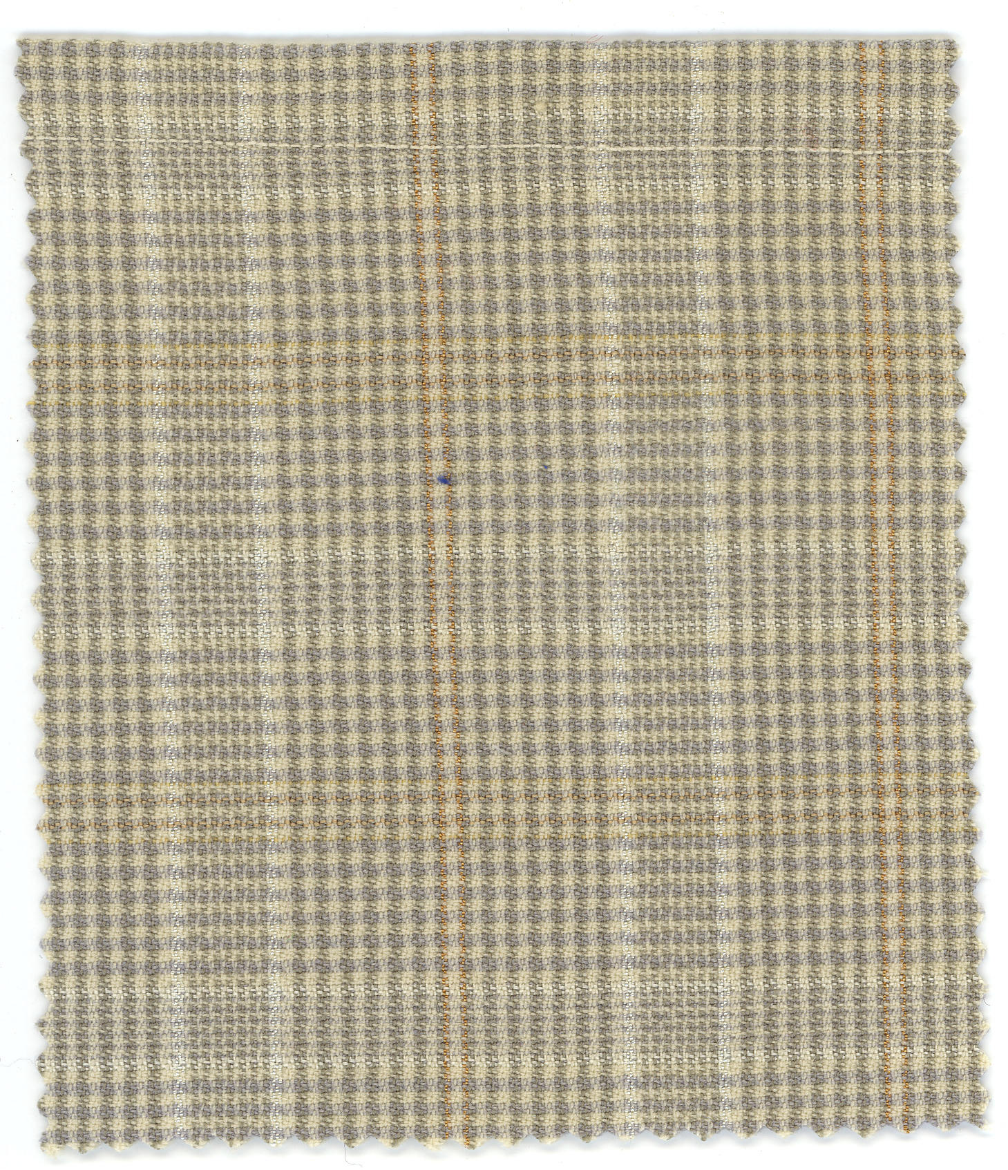 Machinaal geweven wollen stof met ingeweven ruiten in crème en grijs en ingeweven gele, witte en oranjebruine ruiten in glansgaren. De stof is gebruikt voor schouderdoeken ('broekedoeken') door vrouwen en meisjes in Zuid-Bevelandse streekdracht.